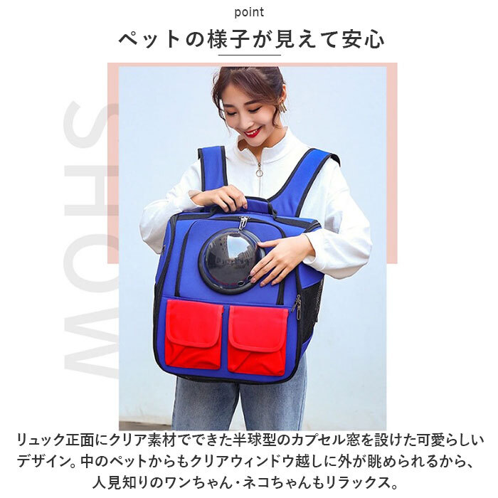 | 商品説明 | ・・まんまるのカプセル窓から、ペットの様子をひと目で確認!お出掛けに便利な「リュック型ペットキャリー」が新登場。 ・【通気性の高い安心構造】 ・リュックの両サイドに丈夫なメッシュ窓と、6つの通気孔を配置することで通気性をしっかりと確保。蒸し暑さの気になる季節も風がフワッと通って快適。 ・【ペットの様子が見えて安心】 ・リュック正面にクリア素材でできた半球型のカプセル窓を設けた可愛らしいデザイン。中のペットからもクリアウィンドウ越しに外が眺められるから、人見知りのワンちゃん・ネコちゃんもリラックス。 ・【ペットの出入りがスムーズ】 ・キャリーの外周に添うようにダブルファスナーを配置したユニークなつくり。ファスナー引き手の位置を両サイドに持ってくることで、側面を扉のように開閉することができるため、ペットの出入りがスムーズ。 ・【ペットが落ち着くファスナー窓】 ・カプセル窓のあるフロント部分は、ダブルファスナーでコの字型に開閉可能。外出先でペットにおやつをあげたり、ネコちゃんの頭を撫でで安心させてあげたいときに便利。 ・【目隠し格子窓に付け替え可能】 ・外からの視線が気になって落ち着かないペットのために、透明なカプセル窓をハニカム格子状のプラスチックメッシュ窓に交換可能。 ・【リバーシブル中敷きマット】 ・ペットが安定した状態でくつろげる中敷きマットは、滑らかなフリース生地面と汚れが拭き取りやすいフラット面、シーンに合わせて使い分けのできるリバーシブルタイプ。 ・【小物用ポケットも装備】 ・カプセル窓の下には、ペットシーツやお気に入りのおやつの持ち歩きに便利なフラップポケットを2つ配置。面ファスナーで開くフラップ式なので、飼い主さんのスマホや小物を収納してもOK! ・【リュック&手持ちの2WAY仕様】 ・手提げスタイルはもちろん、リュックスタイルで背負えば、両手が空いて移動が楽ちんな2WAY仕様。 ・【飼い主さんにも優しいメッシュパッド】 ・背中部分とショルダーベルト裏面は快適なメッシュクッションで仕上げ、飼い主さんの身体への負担も優しく軽減。 |