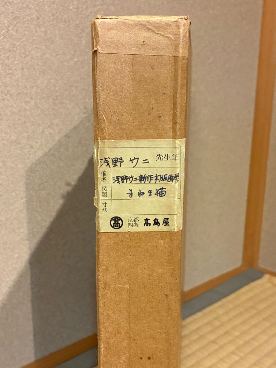 紙箱に京都高島屋で行われた、浅野竹ニ新作木版画展のシールが貼ってあります。