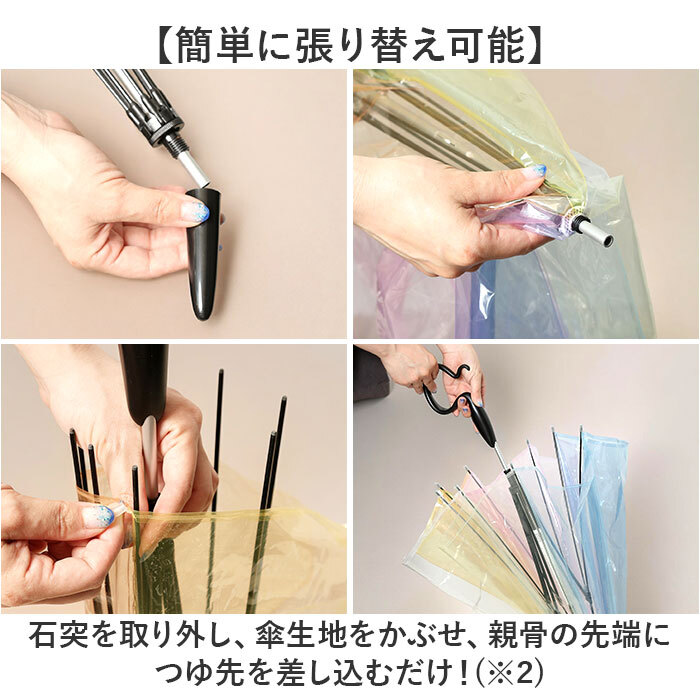 | 商品説明 | ・・【自分だけのオリジナル傘☆】 ・自分でリペアできる、サステナブルな傘。「Evereon (エバーイオン)」の60cm用張替生地。 ・【カラフルな種類で楽しめる】 ・傘生地が破れてしまったり、季節や気分に合わせて着せ替えが楽しめる◎ ・(※1)親骨60cm専用。傘生地のみの販売です。 ・【傘をカスタマイズ】 ・骨の色と組み合わせることで、自分だけのオリジナルの傘が作れるアイテム。 ・【簡単に張り替え可能】 ・石突を取り外し、傘生地をかぶせ、親骨の先端につゆ先を差し込むだけ! ・(※2)バードケージ(深張りタイプ)には張替できません。 ・【傘をオシャレに引き立てる】 ・明るい気分になれるカラフルデザイン。カスタマイズしたお気に入りの傘で、雨の日も楽しくお出かけ♪ |