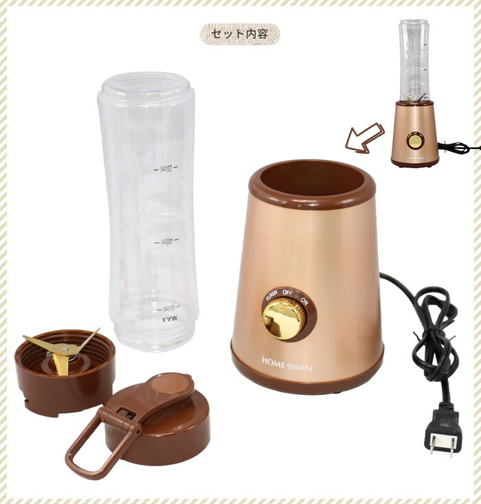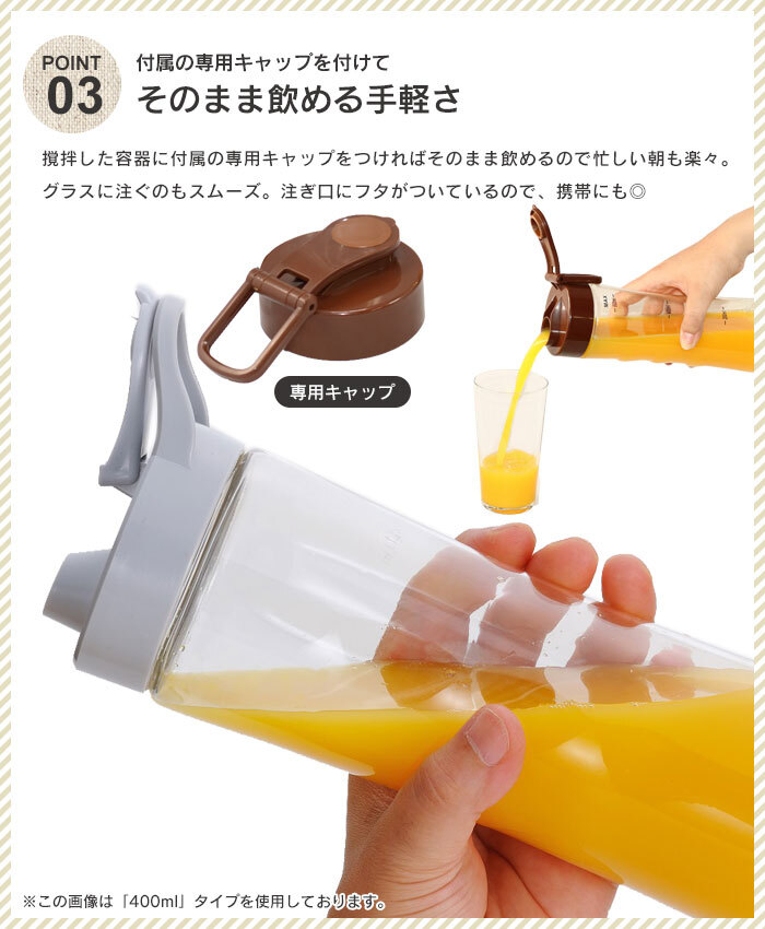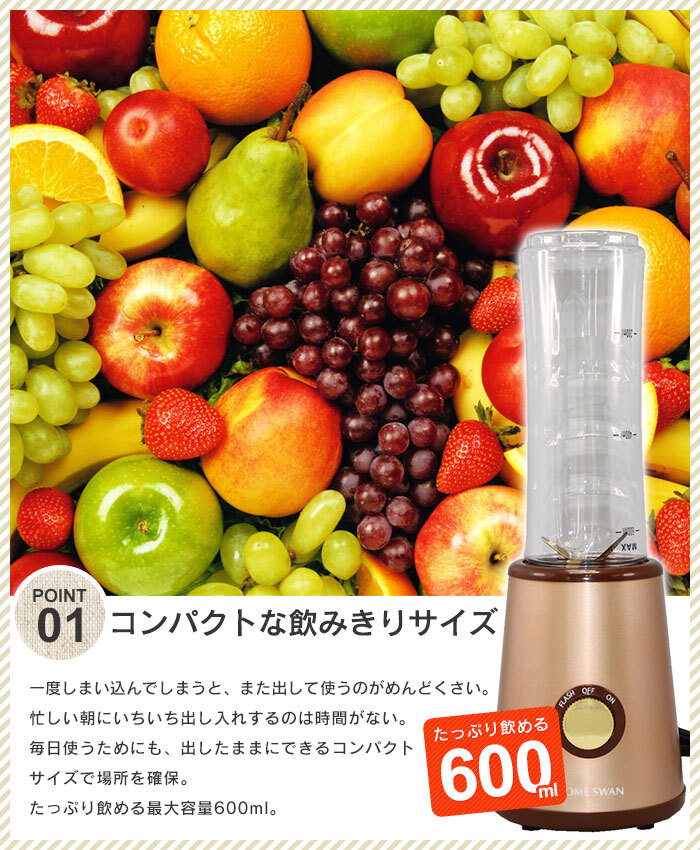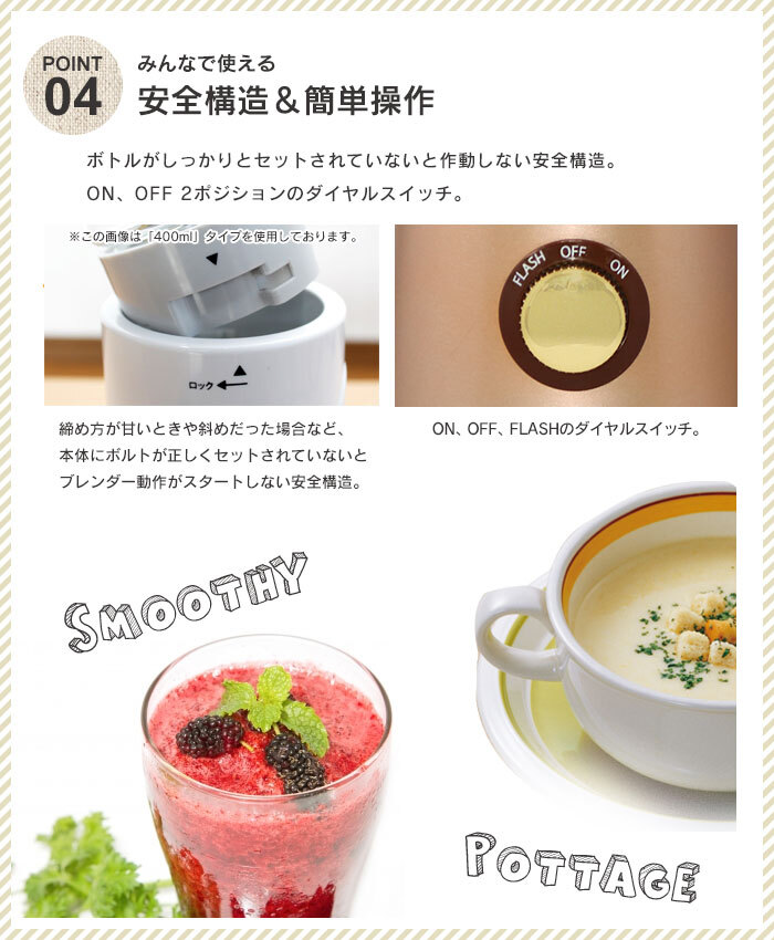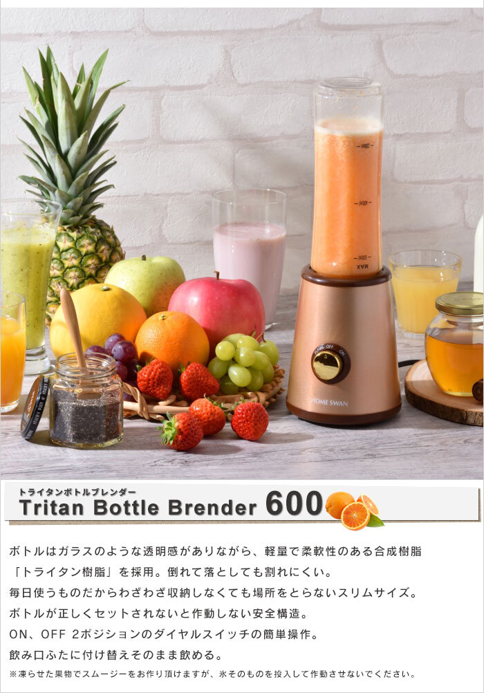 | ◇健康ドリンクがご家庭で作れる。 ◇落としても割れにくいトライタンボトル。 ◇一度にたくさん作れる600ml容量です。 ◇付属の飲み口ふたに付け替え、そのまま飲むことが出来ます。 ◇ボトルが正しくセットされないと作動しない安全構造。 ◇ON、OFF 2ポジションのダイヤルスイッチ。かんたんレシピ付き。 |