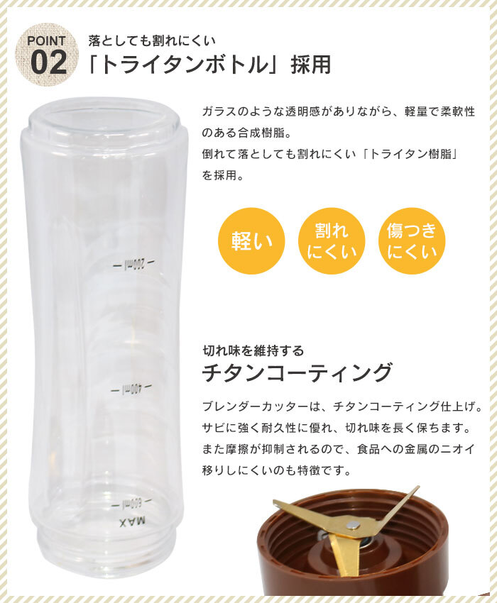 | [樹脂部]トライタン樹脂(ボトル)、ABS樹脂(飲み口ふた・本体) [金属部]ステンレス(チタンコーティング)(回転刃)、ステンレス(本体カバー) |