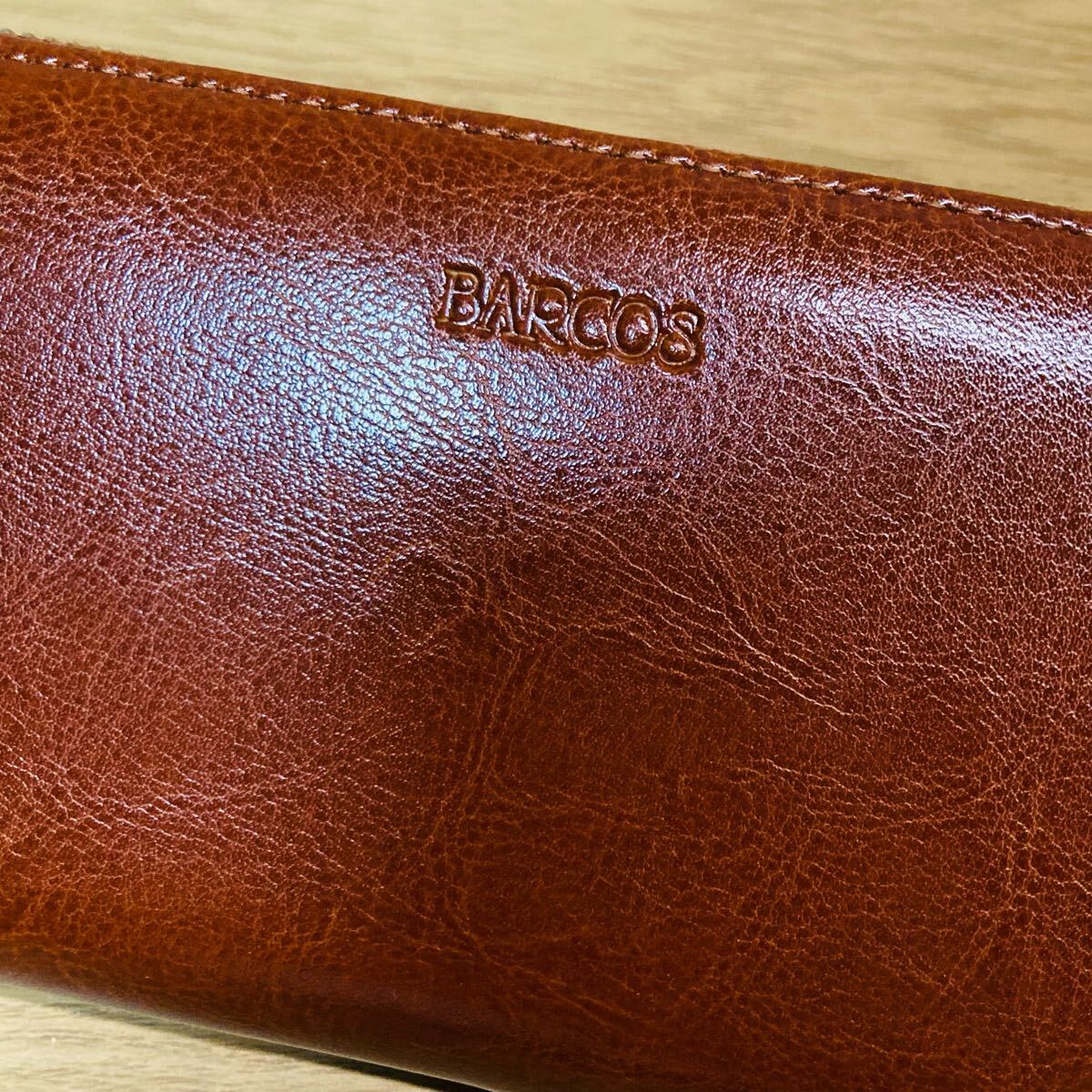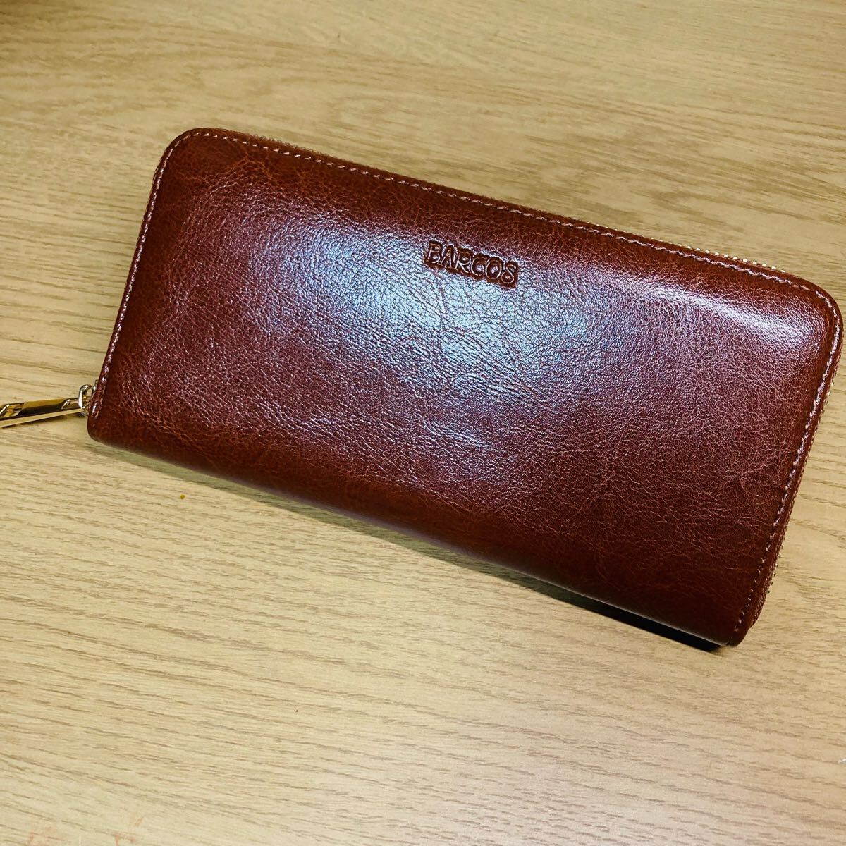 ブラウンの合成皮革製、エンボスロゴ付き長財布。複数のカードスロットとファスナー付きポケットを備え、機能的でスタイリッシュ。