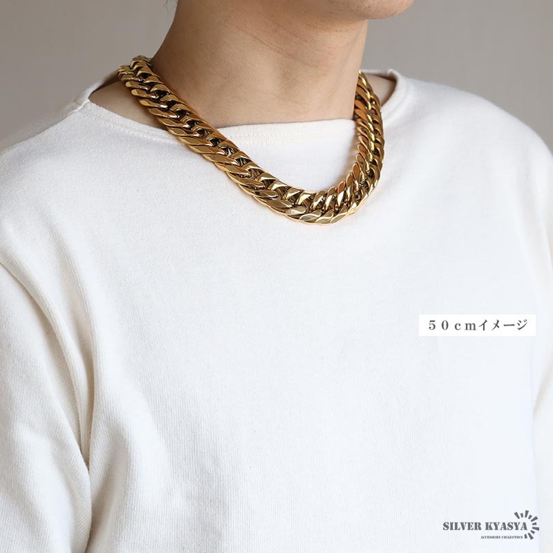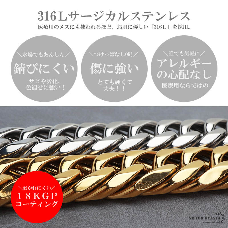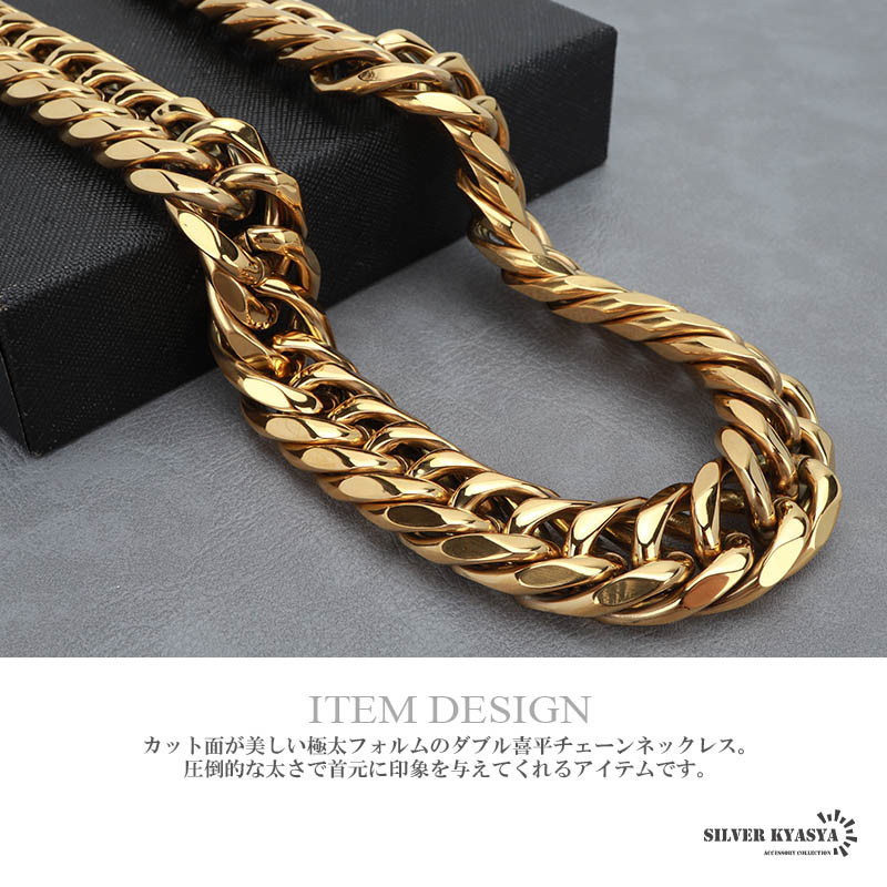 | 商品概要 | ■ITEM DETAIL カット面が美しく最強に太いダブル喜平チェーンネックレス。圧倒的な太さで最強の存在感を与えてくれるアイテムです。 ■316Lサージカルステンレス素材を使用 金属部分は医療用としても知られる316Lサージカルステンレスを採用。耐久性はもちろん耐水性も高く水場での着用も可能。ステンレスの中でも極めてアレルギーを引き起こしにくく、安心して使用できます。 |