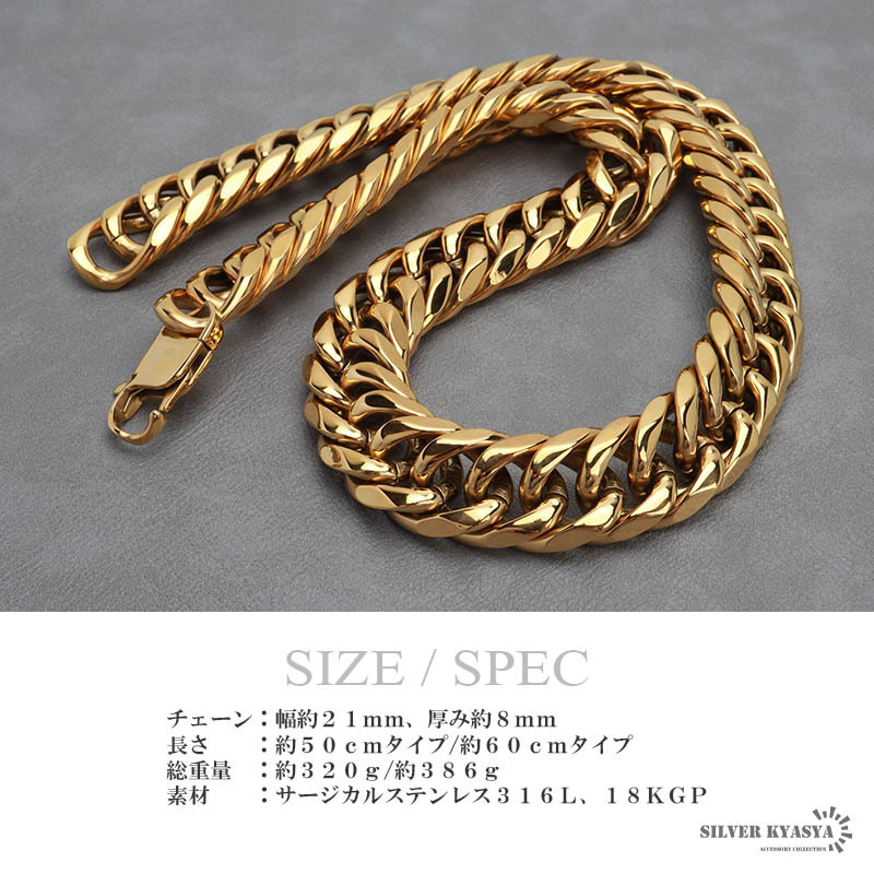 | サイズ | チェーン:幅約21mm、厚み約8mm 長さ:約50cmタイプ/約60cmタイプ 総重量:約320g/約386g |