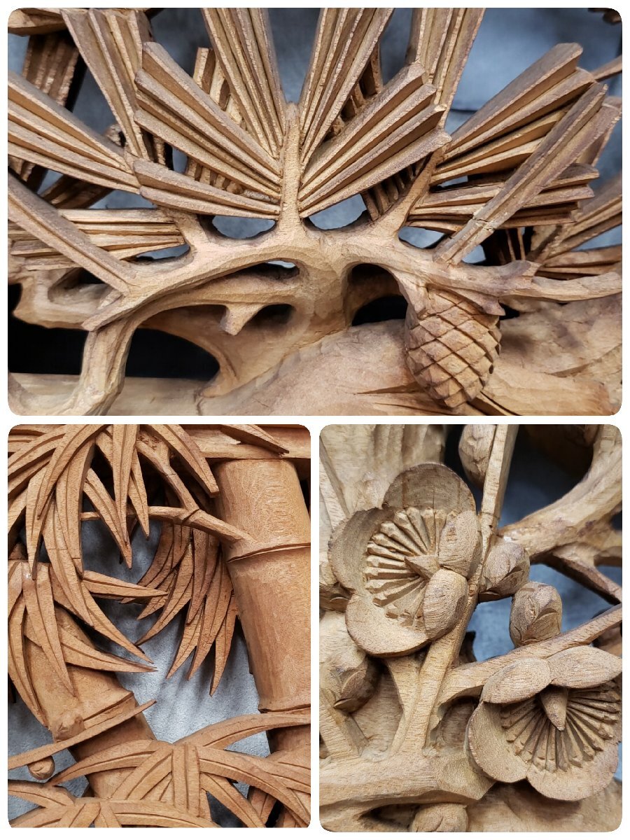 | 商品名 | 彫刻欄間 松竹梅「一対(2枚セット)」細密彫刻 渓山刀 時代建具 古民家再生 和室 古道具 日本家屋 旧家 リペア アンティーク | |||||||||||||||||||||||||