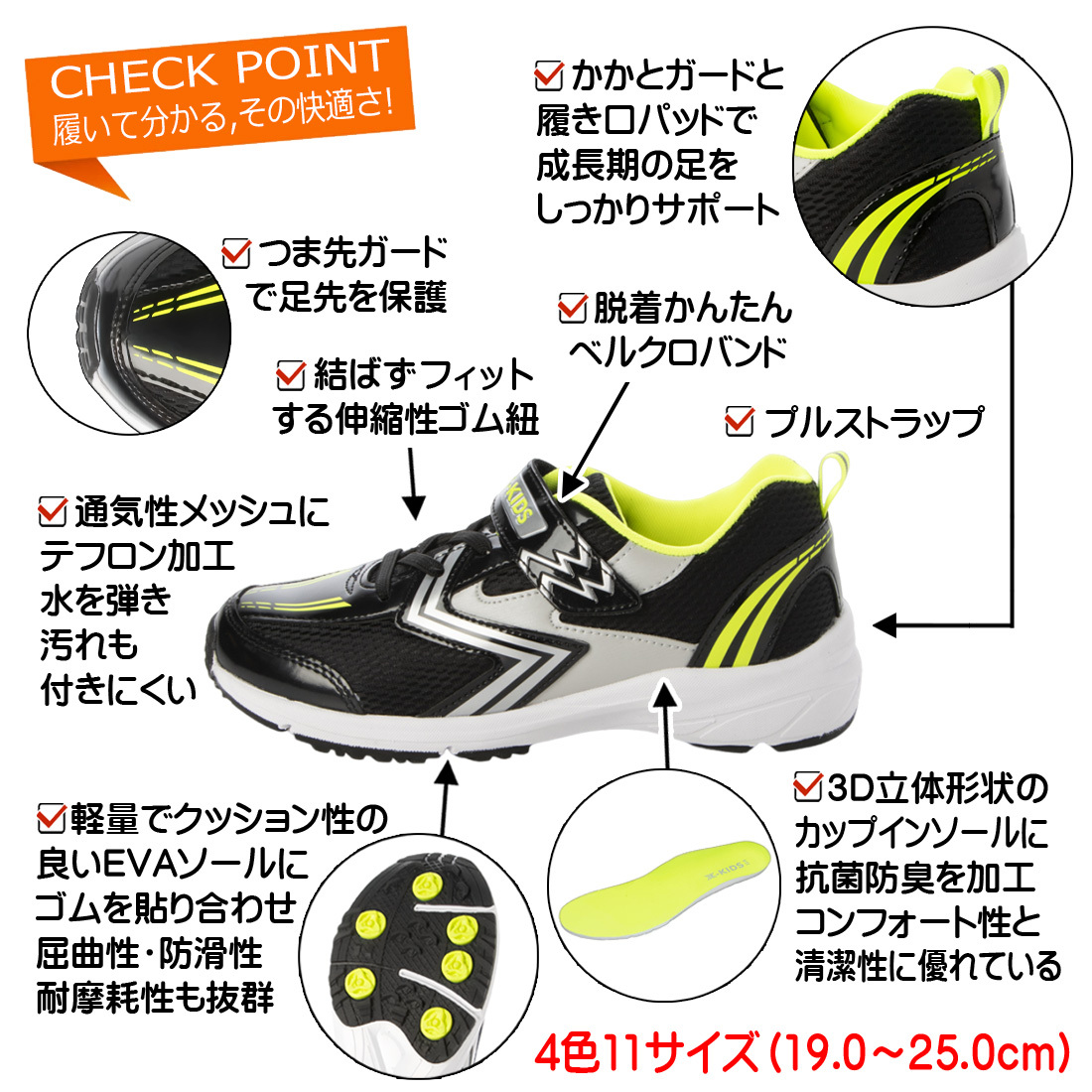 機能的、デザイン的、品質的にも自信があります。4色11サイズと豊富なバリエーションをご用意しました。通学用、運動用、普段履き用としてお勧めします。