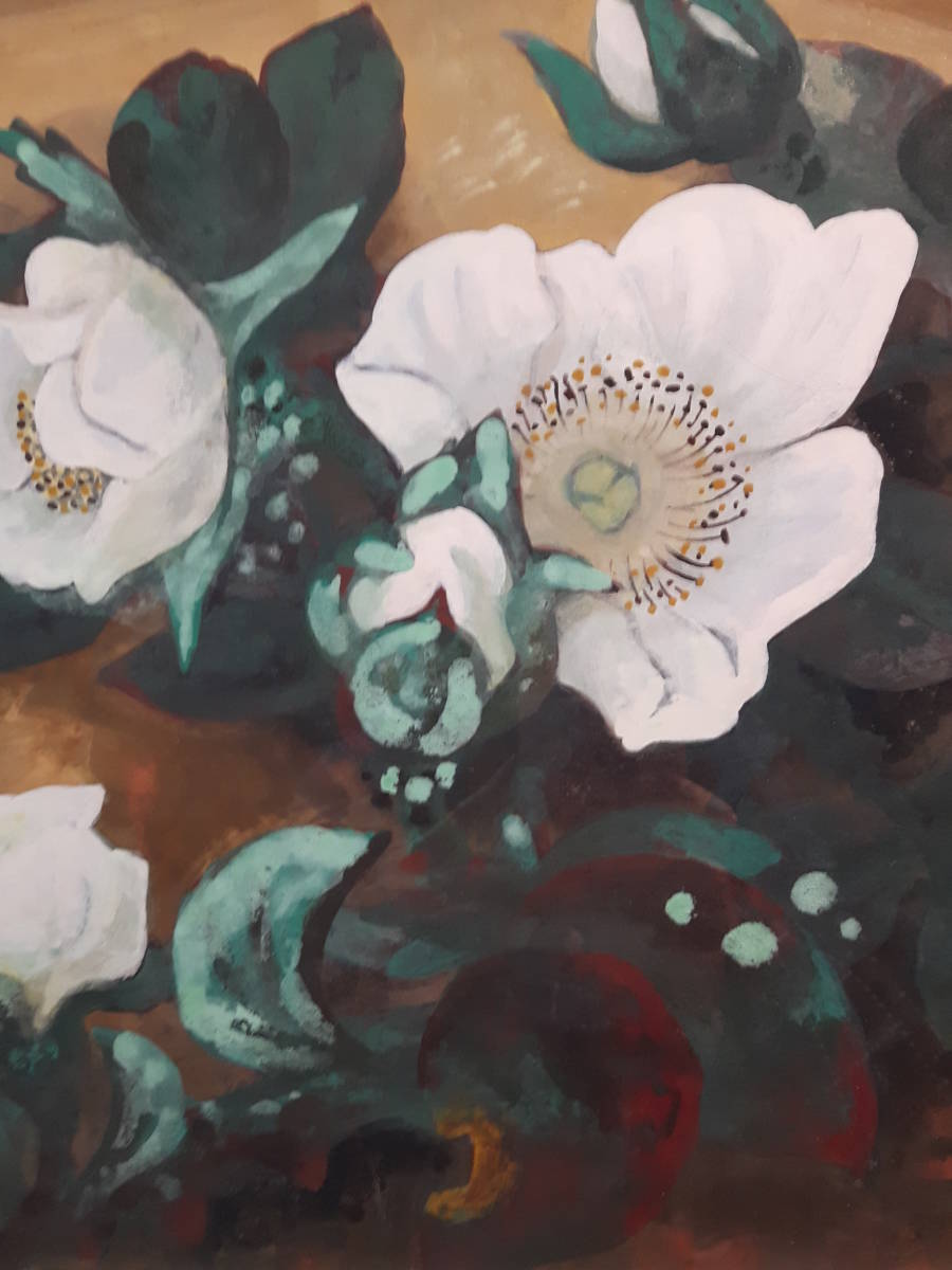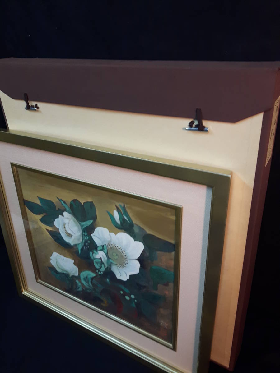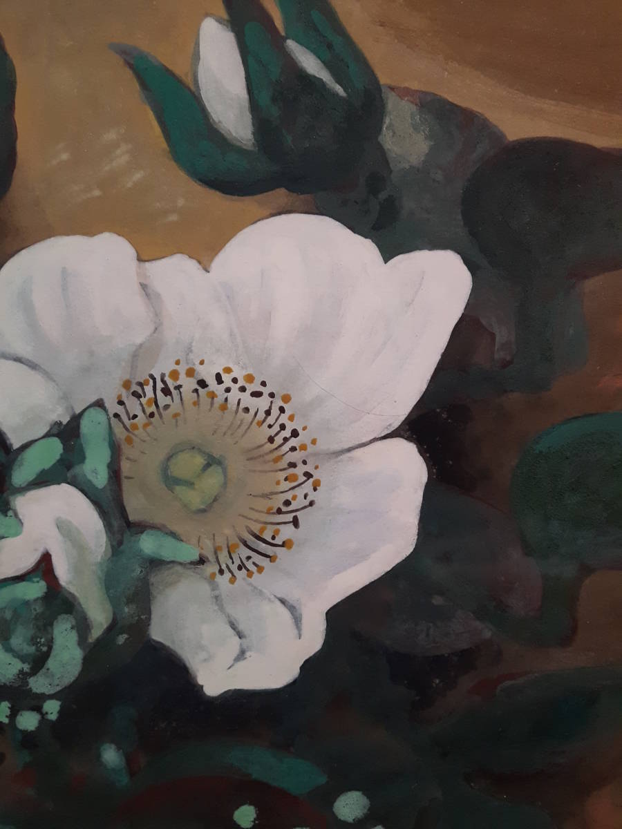 作品寸法   約44cm×36,5cm  状態良好 奥行きのある絵画です。野崎の個性的な絵画白さ際立つ薔薇