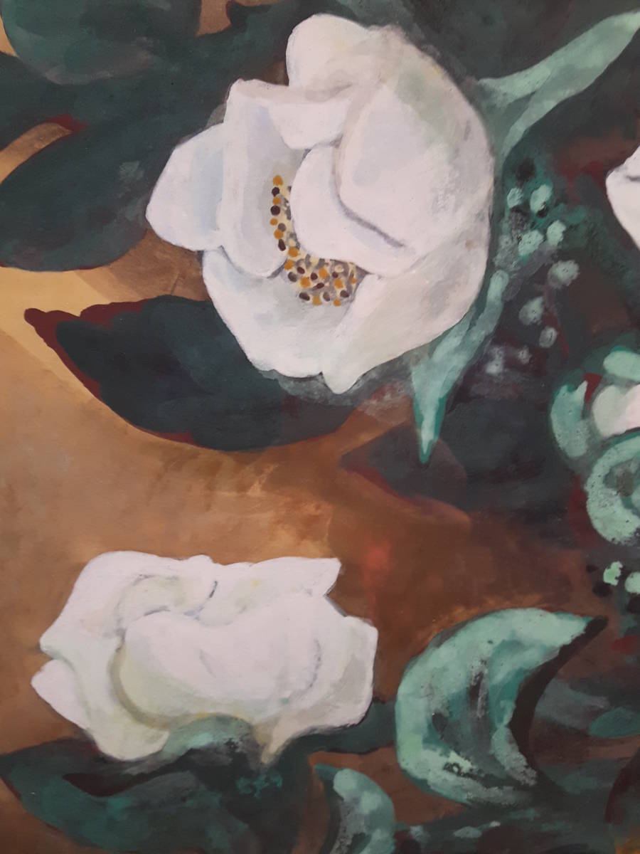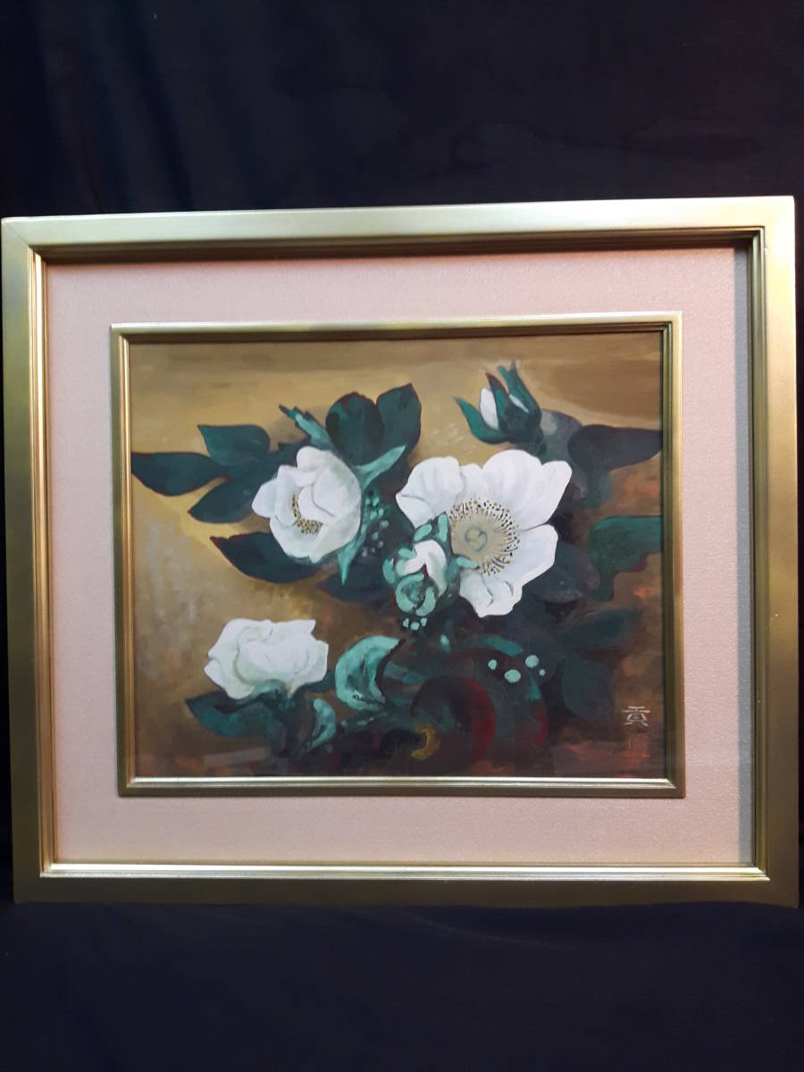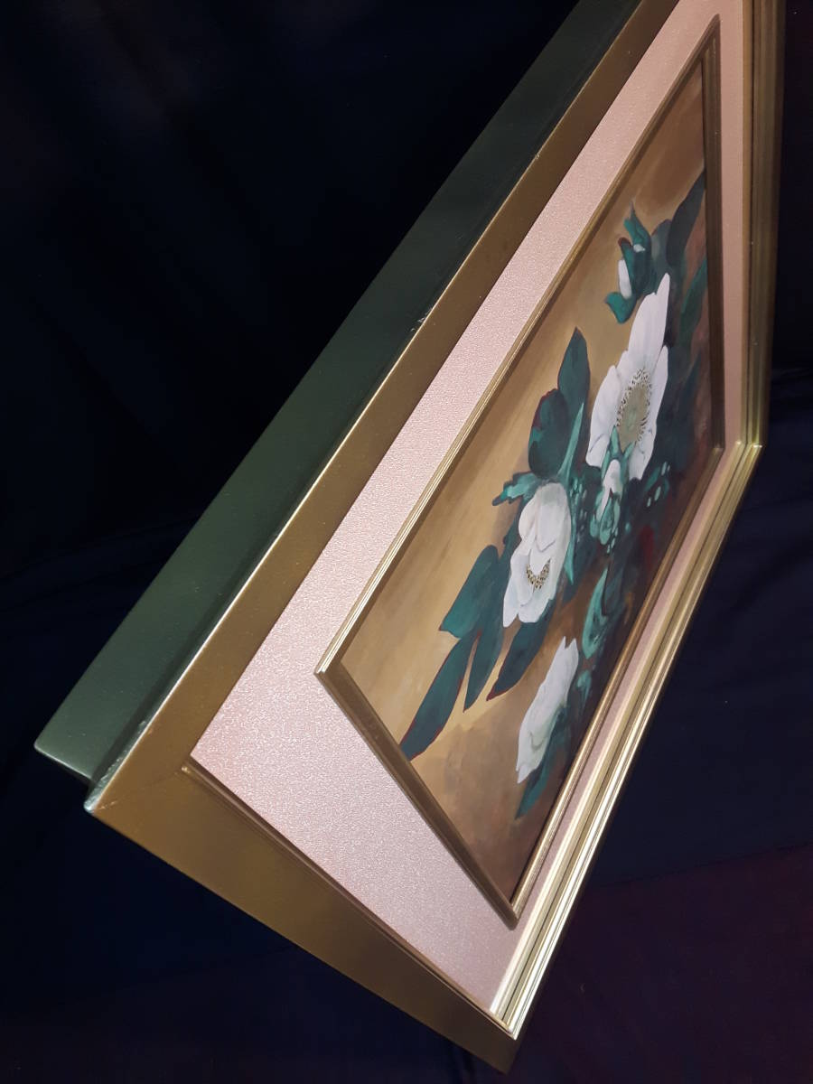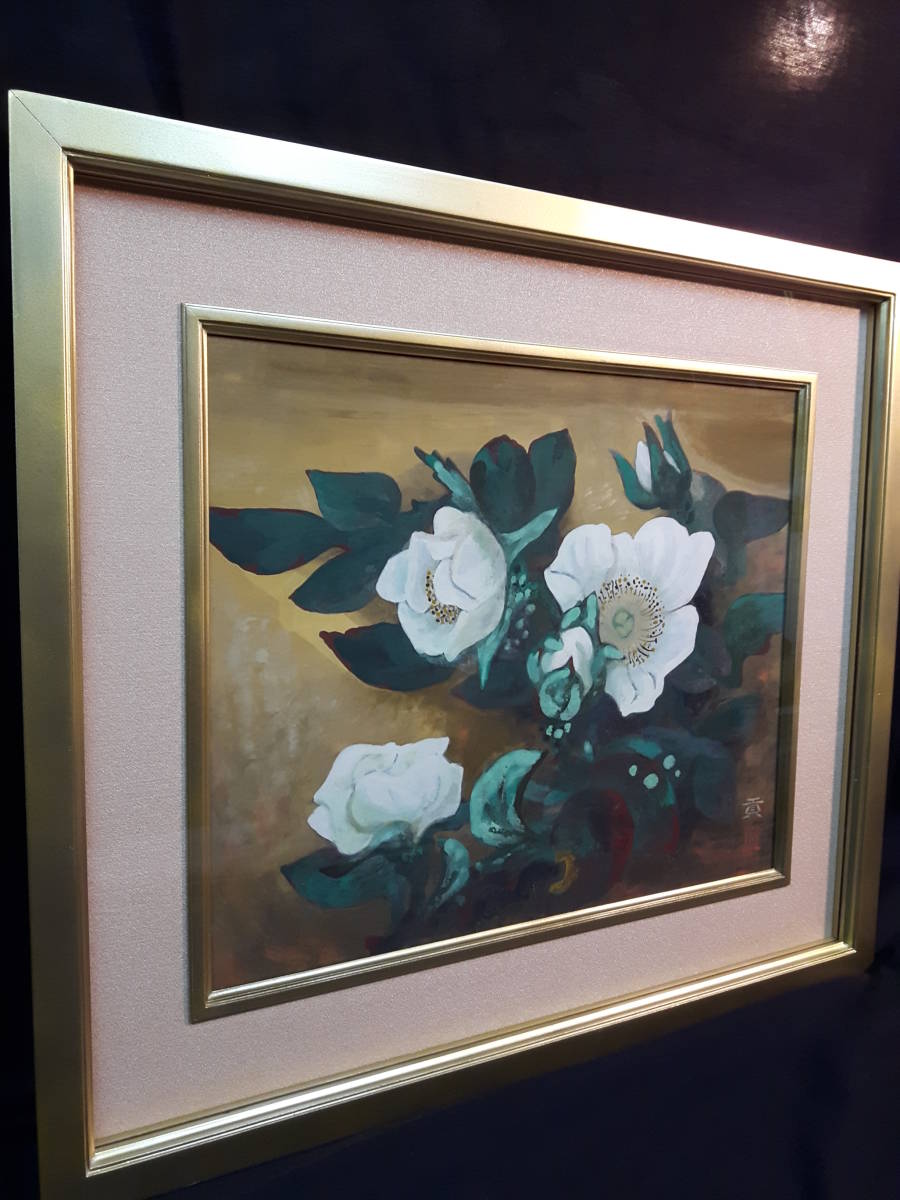 作品寸法   約44cm×36,5cm  状態良好 奥行きのある絵画です。野崎の個性的な絵画白さ際立つ薔薇