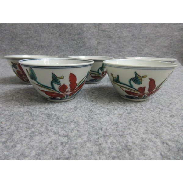 九谷焼 大明成化年製 色絵 花文 汲み出し茶碗 5個です。 商品画像が実際の商品そのものですので、ご入札前にしっかりとご確認いただきますようお願いいたします。 |