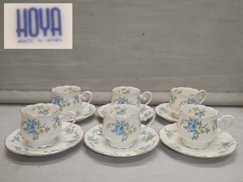 ●●HOYA ホヤ 金縁 ブルーフラワー 青と黄小花 花柄 カップ&ソーサー 6客セット フリル コーヒー 珈琲●●
