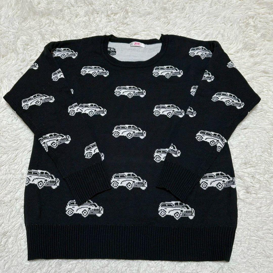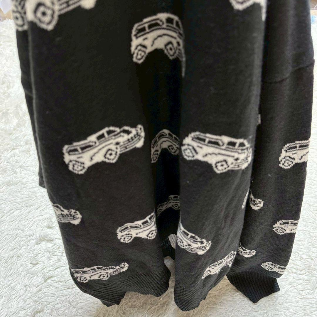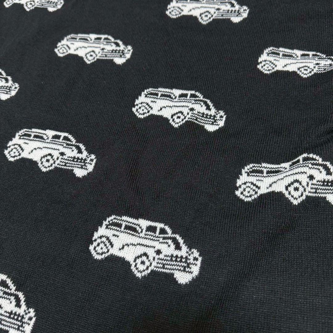 車の柄が特徴的な黒の長袖ニットセーター。