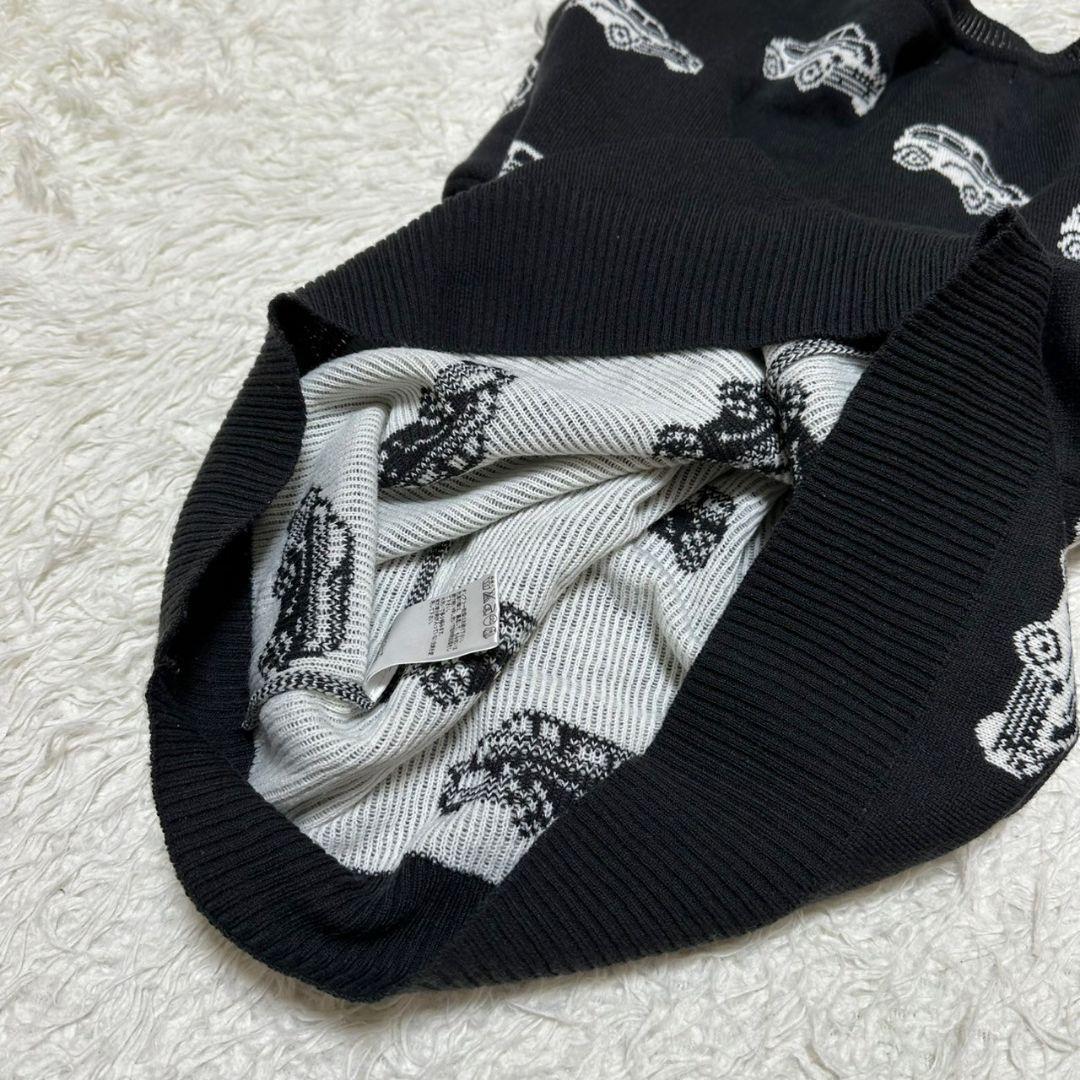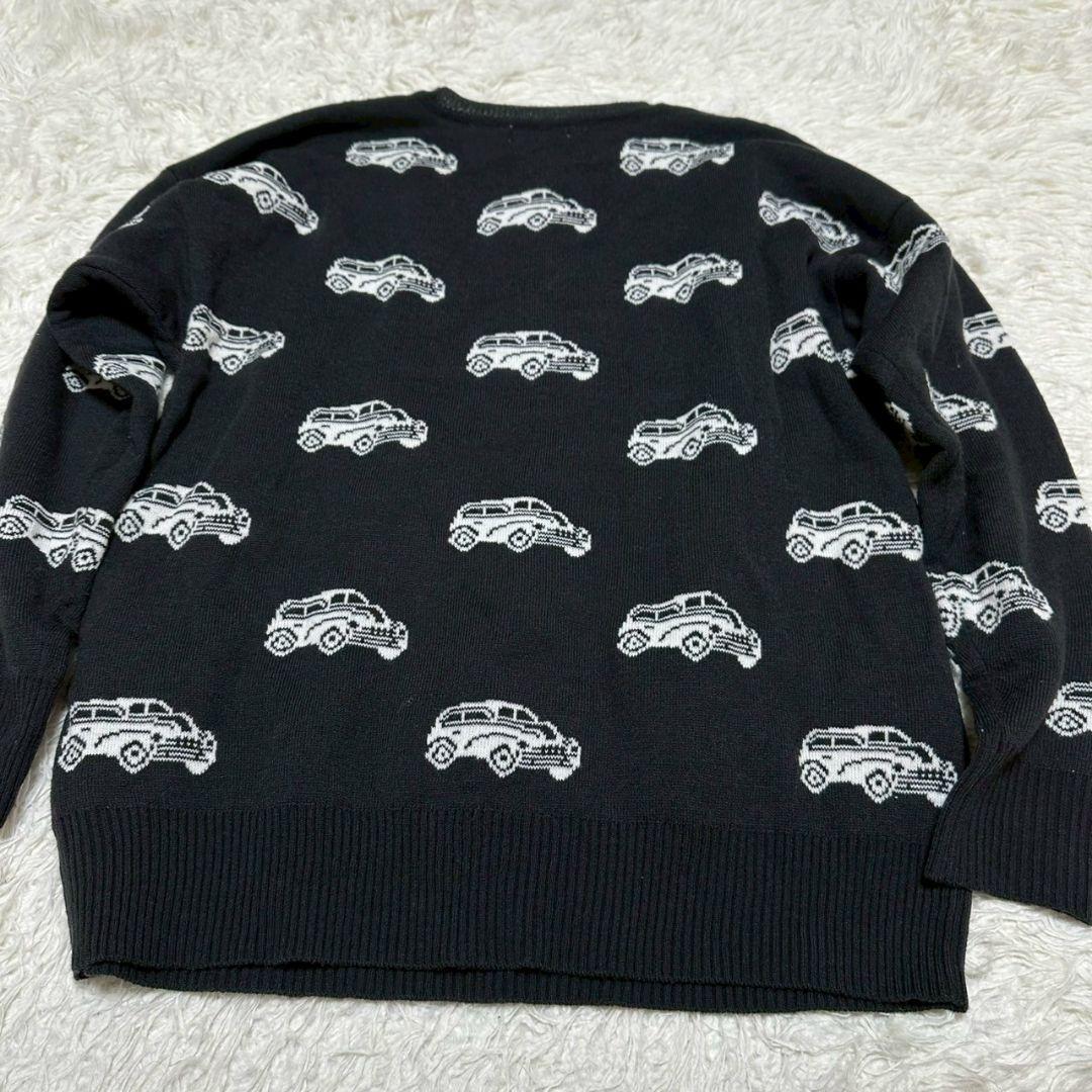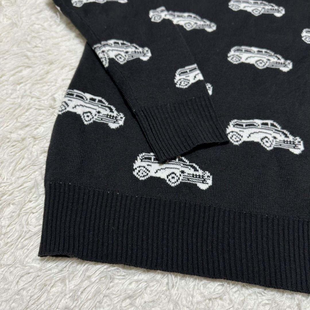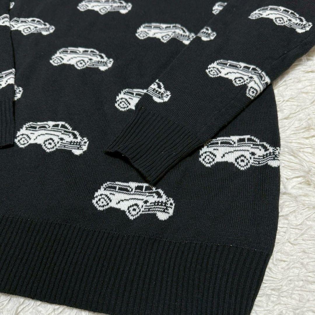 車の柄が特徴的な黒の長袖ニットセーター。