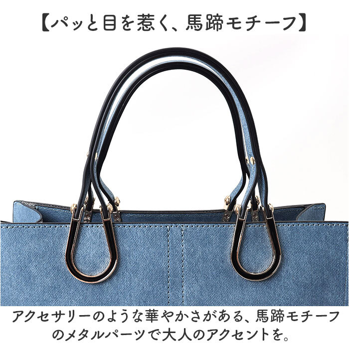 | 商品説明 | ・・【幸せをキャッチする馬蹄モチーフ♪】 ・お出かけにぴったりな上品2WAYバッグ「エポメタルデニムライクトート」が登場。 ・【デニム風の垢ぬけデザイン】 ・風合いのある、デニム風デザインの合皮素材を採用。上品だけどこなれ感のある印象に。 ・【パッと目を惹く、馬蹄モチーフ】 ・アクセサリーのような華やかさがある、馬蹄モチーフのメタルパーツで大人のアクセントを。 ・【細部までこだわったおしゃれさ】 ・内布はグレンチェック柄を採用。バッグを開けたときにもおしゃれ魅せする、上級者デザイン。 ・【見た目以上のたっぷり収納】 ・メイン収納に、あおりポケットを2つプラス。1日分のお出かけ荷物がすっぽり入る収納力。 ・【スマートに自立するバッグ】 ・バッグはテーブルや椅子に置いても様になる、自立する作り。底鋲つきで、傷つきにくい。 ・【シーンに合わせてショルダーにも】 ・手持ちとショルダーの2WAY仕様。シーンや気分にで、お好みでチェンジ。長さ調節OK。 ・【ポケット仕様】 ・メイン収納:オープンポケット×1、ファスナーポケット×1 ・メイン収納前後:あおりポケット×2 |