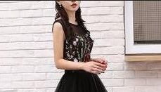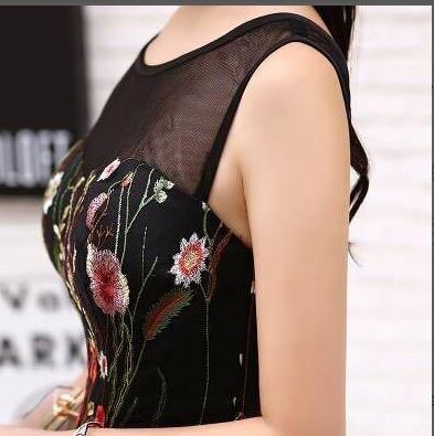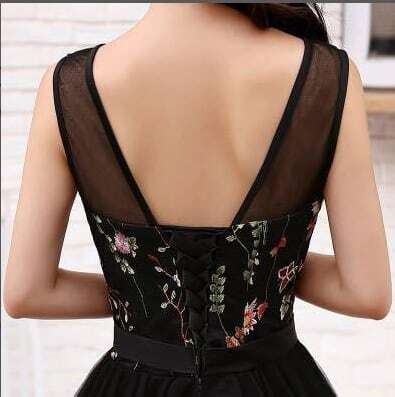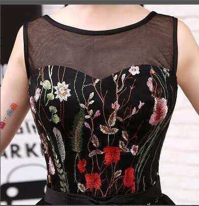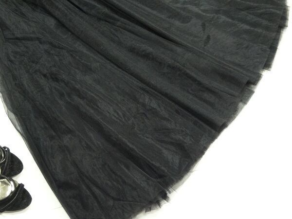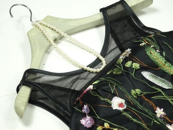 花刺繍ミモレ丈チュ-ルパ-ティ-ドレスです。黒のサテン地の上に、花刺繍をほどこしたチュ-ルが重ねられた豪華でフェミニンなデザイン。デコルテラインの透け感が大人の雰囲気を醸し出し、シックで上品な女性を表現。パーティやイベント、コンサート、結婚式にと、さまざまシーンで活躍してくれる美しい一着。背中網掛け。腰から下ファスナー有。胸パット付。