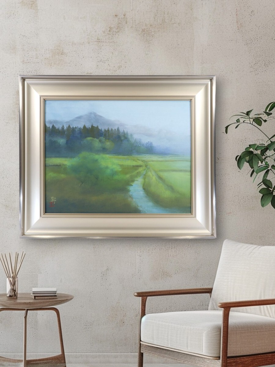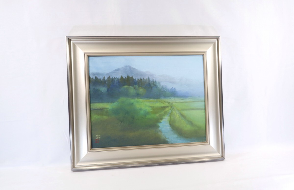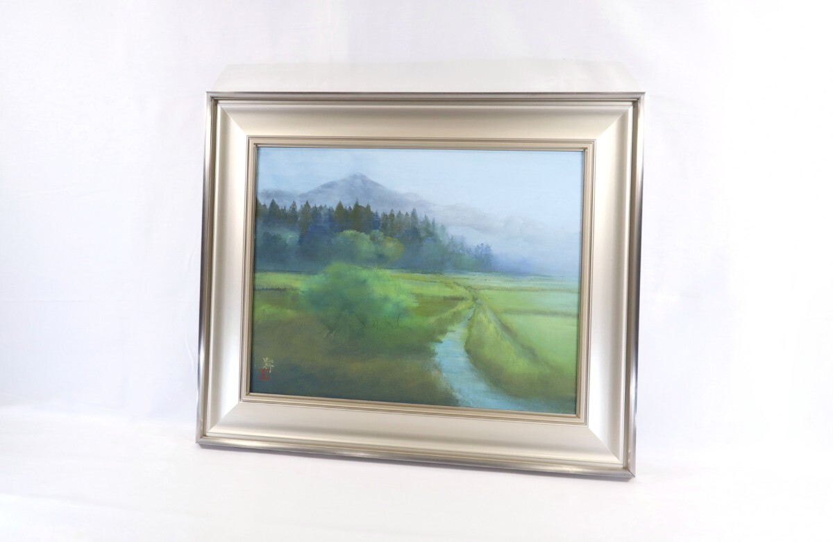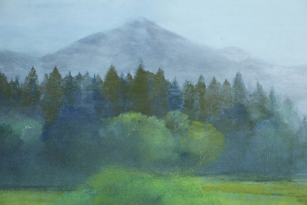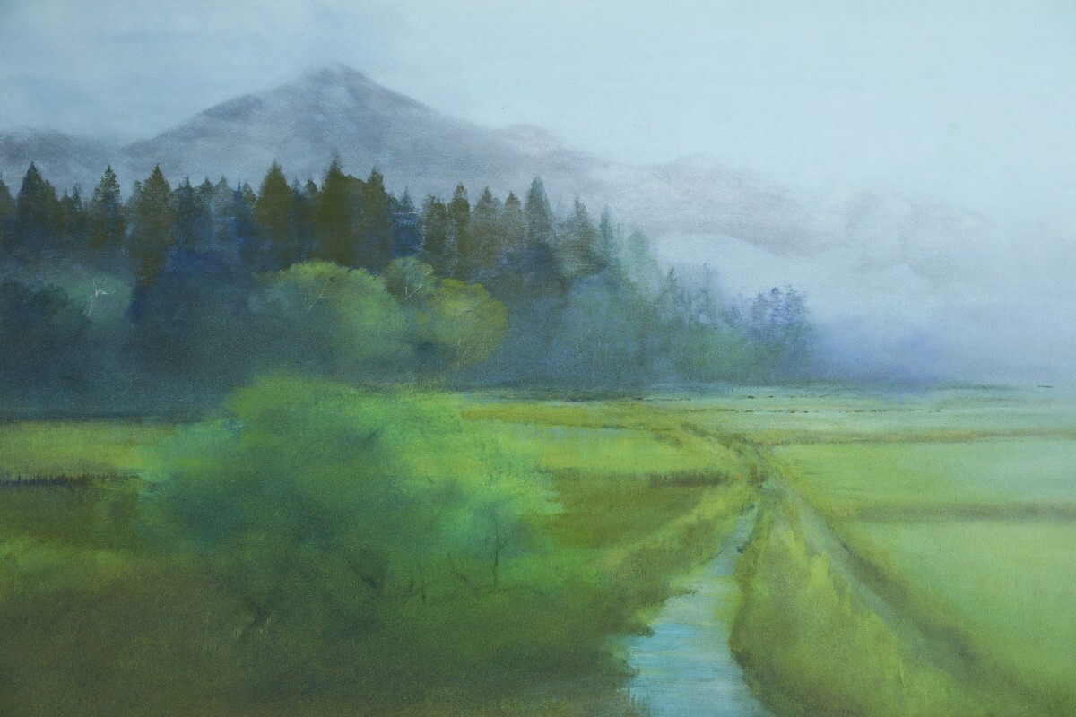 真作 青山忠行 日本画「春朝」画寸 53cm×41cm 10号 愛知県出身 日府展理事 春の柔らかな光と朝霧の透明感を静謐な色彩で巧みに表現 11216