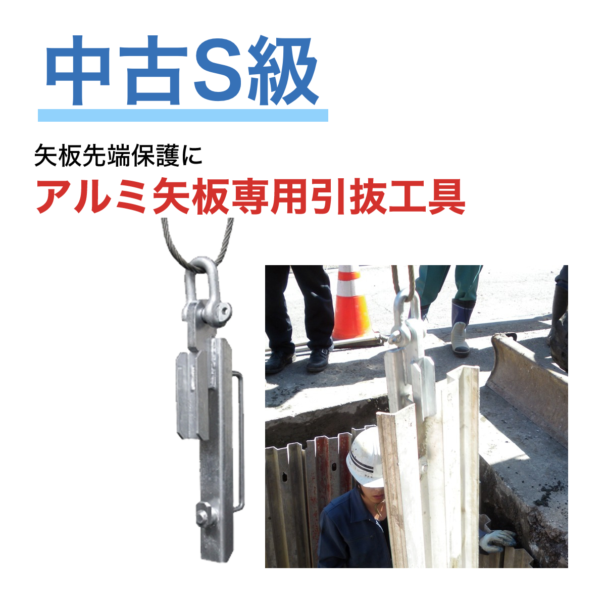 ホーシン アルミ矢板HAY-3833N専用 引抜き工具【中古S級】 ※こちらはHAY-3833N専用の引抜き工具です。 矢板の引き抜き穴にセットして、簡単に早く撤去時の引き抜き作業が行え、矢板先端や引き抜き穴を保護します。 |
