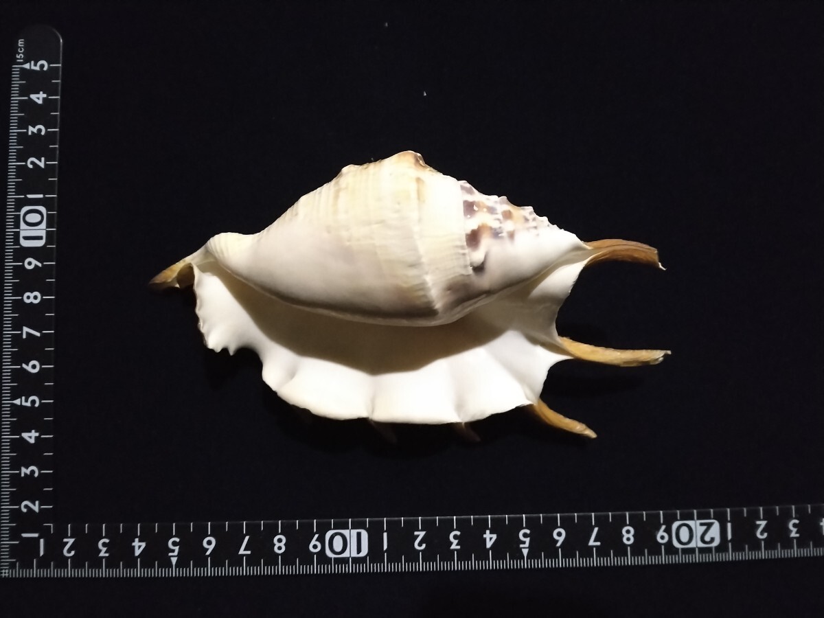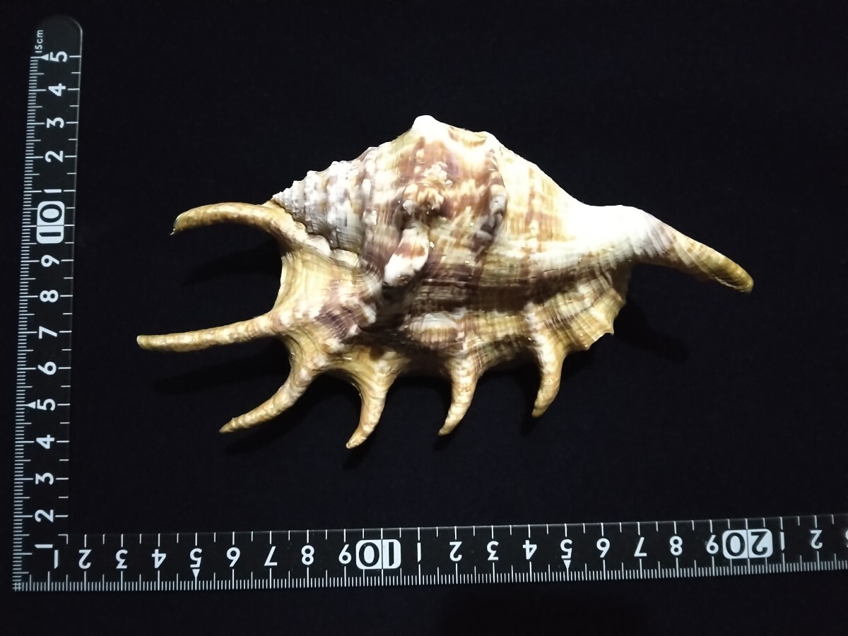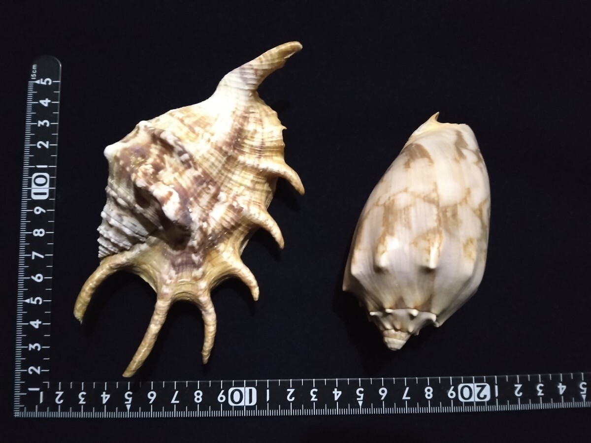 #天然貝標本クモガイ & コオロギボラ。長期保管品 大きさクモガイ約148㎜X82㎜ 厚さ約51㎜ 総重量約110g 産地は不明。一部欠け、表面劣化あり。大きさコオロギボラ約102㎜X54㎜重量約88g 産地不明。状態は、画像を参考にしてください。配送は、郵パック発送になります。