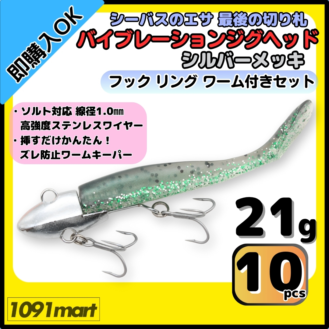 【送料無料】バイブレーションジグヘッド シルバーメッキ仕様 21g フック リング付き 10個+ワーム16本セット VJ風 シーバスルアー