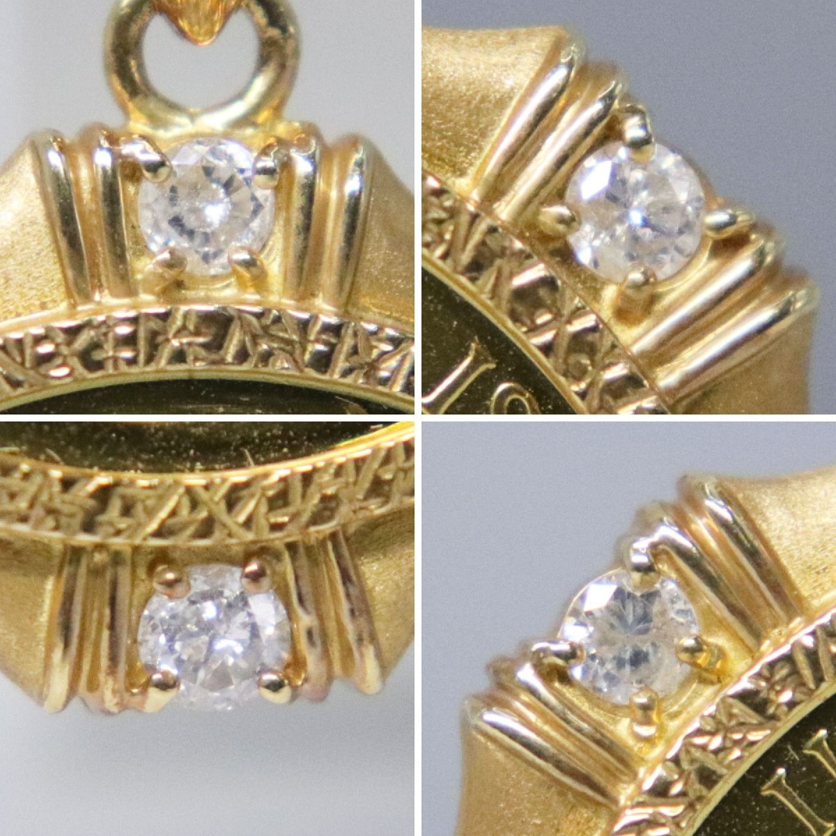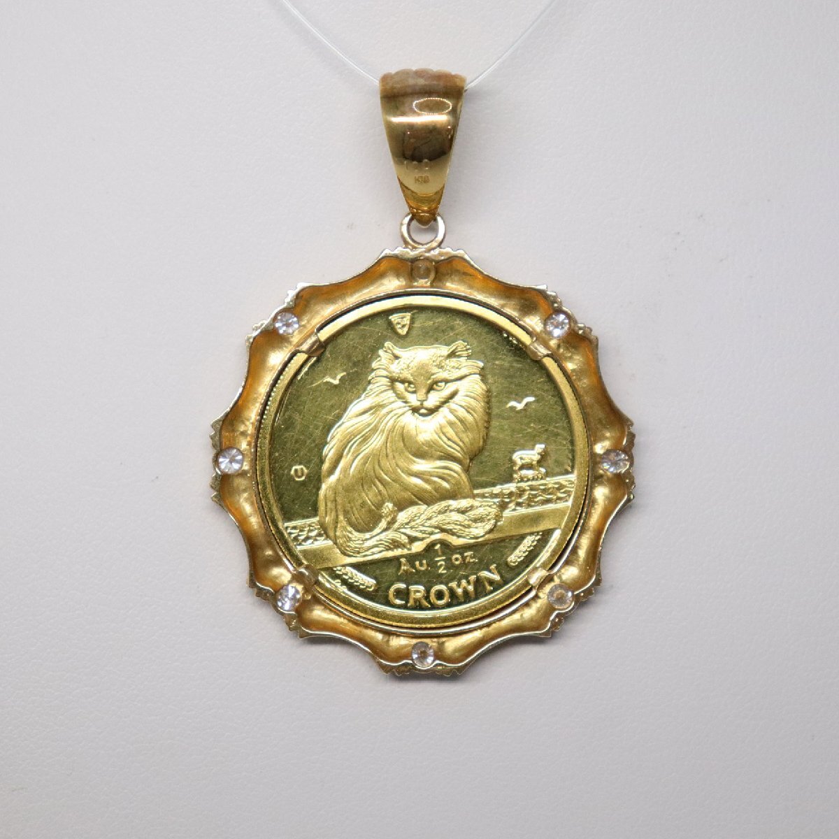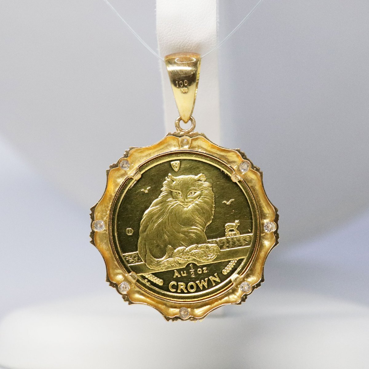 ダイヤ付 K18枠/K24 1995 マン島キャット エリザベスII世 金貨 1/2oz ペンダントトップ PH コイン 重量約26.3g D1.00ct 中古 送料無料!
