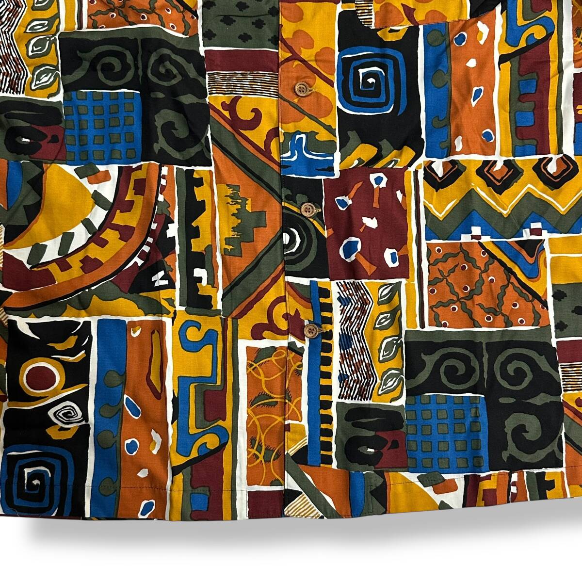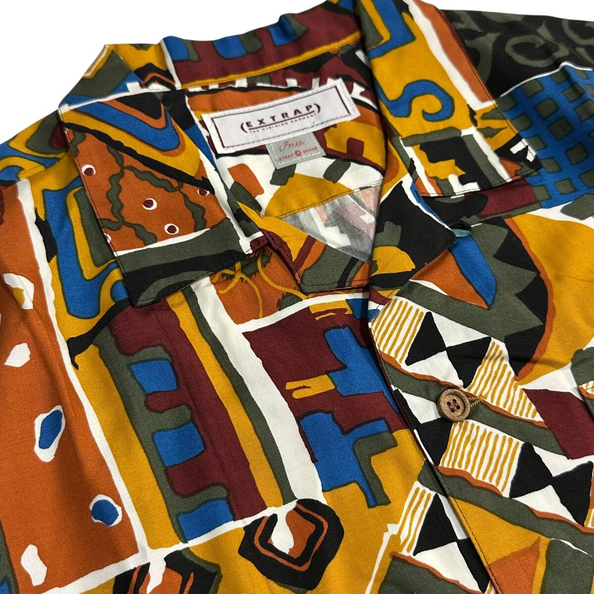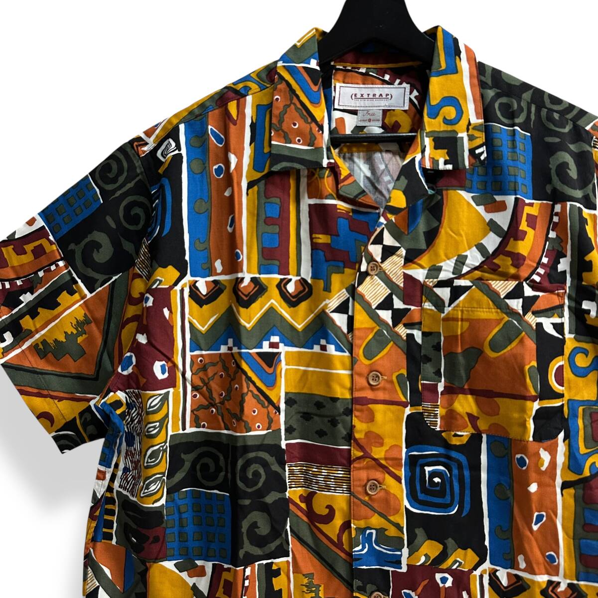 美品 レア【EXTRAP】VINTAGE 90s~ アートデザイン 総柄 レーヨン100% ビンテージオープンカラーシャツ 日本製 個性的 派手シャツ