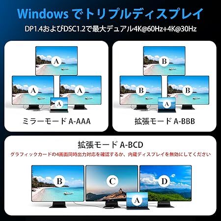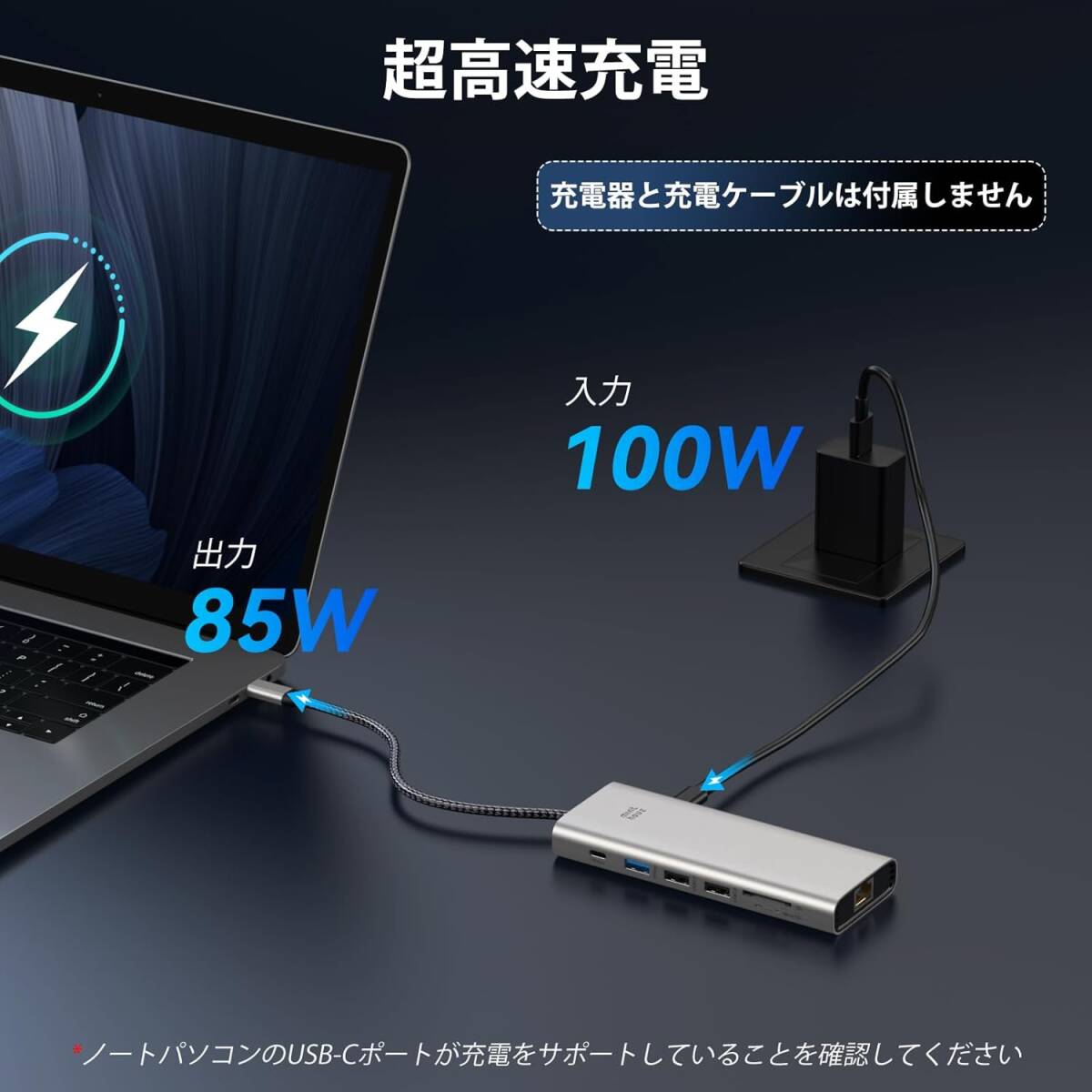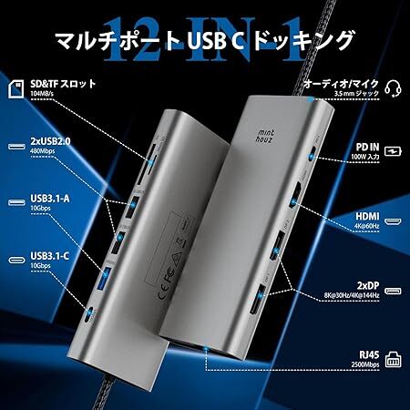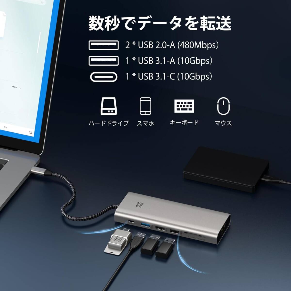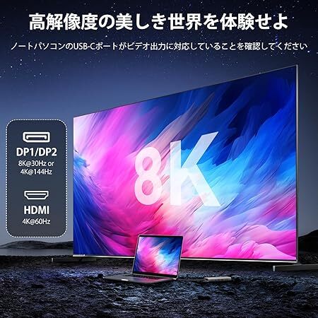 | 特徴 | 10Gbps 高速データ転送 、PD 100W高速充電、有線LAN、 HDMI出力、USB3.1 Gen2、8K@30Hz、4K@144Hz |