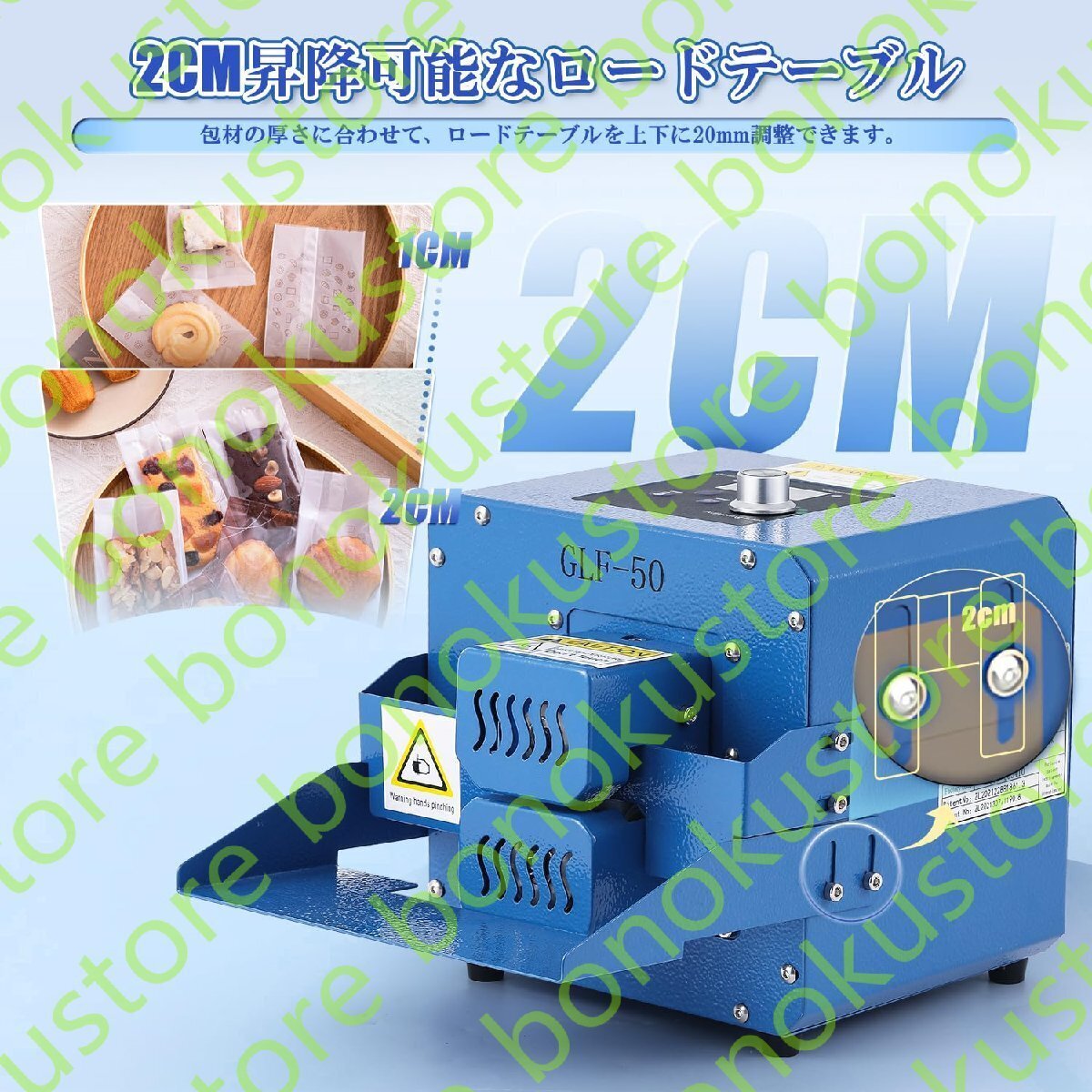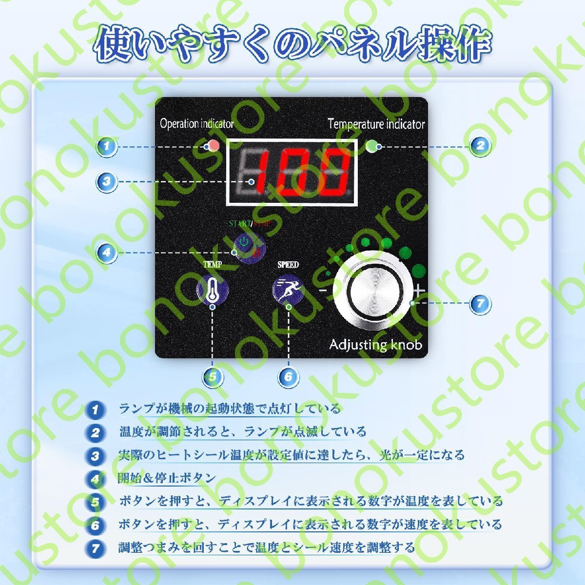 【デジタル表示・簡単な操作】 ディスプレイが搭載され、シーラー温度と速度が可視化し、簡単なノブ制御で異なる種類やサイズの袋に適切な速度と温度を選択できて、機械に苦手の初心者でもうまく使用できます。 【2CM昇降可能なロードテーブル】 全自動シーラー機はロードテー
