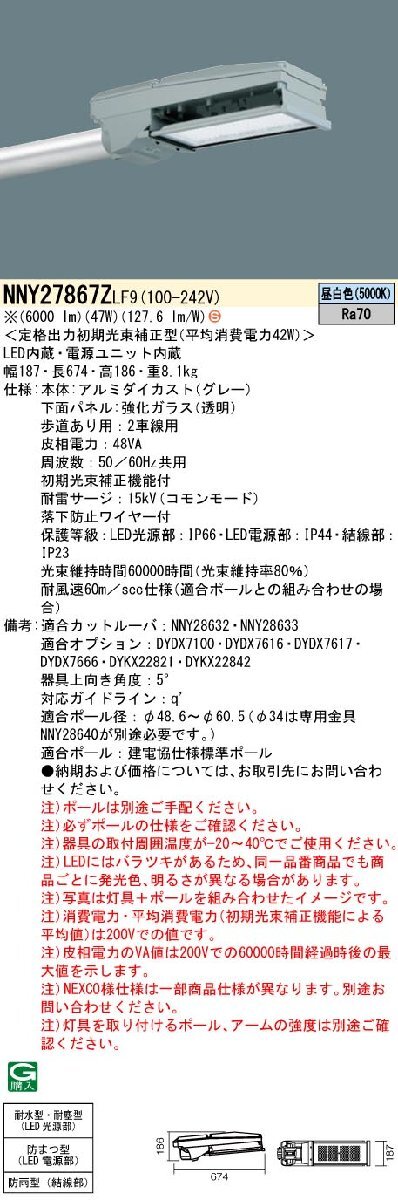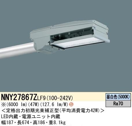 ▽パナソニック 道路交通灯 NNY27867Z LF9 昼白色 耐水型・耐塵型 水銀灯250形1灯器具相当 歩道あり用・2車線用 ※ポール別売り
