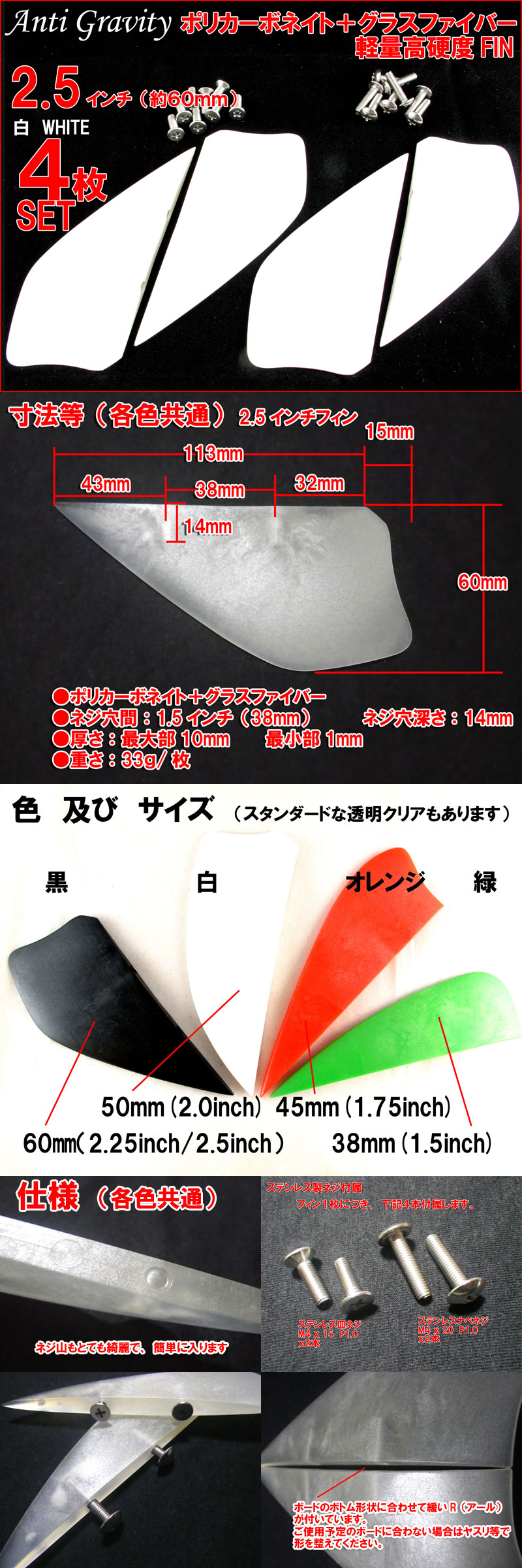 ●Anti Gravityより色付きのカラフルフィン新登場!ボードに合わせた色使いや他人のボードと区別する為、または高さによって色を区別するなど、色んな使い道があります。 チームや仲間で同じ色のフィンを使っても面白いですよね! ●カイトボーディング用ボードの2.5インチ(実測60mm 2.38インチ)フィンです。ネジピッチさえ合えば色んなメーカーのボードに取り付け可能ですので、ダメージを受けてガリガリになってしまったり壊れてしまったフィンの修理に。 お手ごろな価格設定ですので、色んな高さのフィンをお試しください!たかがフィンですがされどフィン。乗り心地が変わりますので、乗り方や水面の状況に合うフィンを探す事ができると思います。 ●素材はポリカーボネート+グラスファイバーです。戦闘機のキャノピーなどにも使われる素材ですので、高強度で軽量です。一般的なG10素材よりも25%ほど軽く作る事ができます。 また、色は塗装ではなく素材に練りこんでありますので、表面が剥がれて中の色が出てくるようなこともありません。 ●一般的なG10素材のフィンのネジ穴は成型後ドリルで開けるためこの部分がウイークポイントとなり、割れたり抜けたりする事があります。こちらのPC+FG素材はねじ山を成型時に作り、複合素材を高圧力のプレスで成型している為、ネジがすんなりと入り、また強度も十分確保されています。 ●有名ブランドではありませんので値段が安いですが、作りはそこそこしっかりしています。自分でも1年以上使用していますが特に問題ありません。 基本的に大きな(高い)フィンを使えばアップウインド性能が上がり、エッジを効かせやすくなります。逆にクイックになりすぎて扱いづらい時や、フラットな水面の場合は大きなフィンは必要ありません。(個人的な考えですので間違っていたらすみません) ●寸法等:全長128mm(ボード接触面113mm) 高さ60mm(2.5インチ) ネジ穴間38mm(1.5インチ) フィン1枚につき ステンレス製 皿ネジM5x15mm x2 ナベネジM5x20mm x2 付属 |