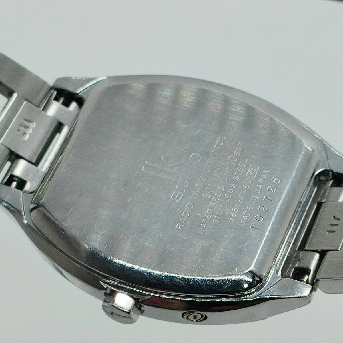 接写写真を掲載しているので、周りの撮影道具・光・影等が写り込んでいる場合があります 又肉眼では見えない微傷等が誇張されている場合があります 使用感ありますが、目だつ大きなダメージや汚れはありません 太陽光で充電して順調に動いています *****腕周りを必ず確認の上ご購入下さいませ***** 化粧箱・取説・保証書・余りコマ等ありません、ベルトを含む本体のみです、写真が全てです ■状態(目視) ・文字盤・・・綺麗な状態です ・ガラス・・・綺麗な状態です ・ケース・・・微キズ・微微スレ等見られます ・裏蓋・・・微キズ・微スレ等見られます ・ベルト・・・使用感がありますが、まだまだお使いいただけます(純正品) ■リューズ等問題ありません 96時間動作確認済・精度良好です 発売・購入時期や販売価格・オーバーホール歴等不明です 発送時十分動作を確認して発送いたしますが、中古時計の為到着後の動作保証は出来ませんのでご了承下さいませ 中古品の為、現状の防水性はわかりません 突然出品を取り消す場合があります ■仕様 ケース素材:ステンレス ケースカラー:シルバー 文字盤カラー:シルバー ケースサイズ(約):W27.8mm(リューズ含まない)×H35.0mm(ラグ含む) 厚み:約8.4mm ベルト幅:約10.8mm 腕周り:約16.5cm 重さ:53g 448 | |||