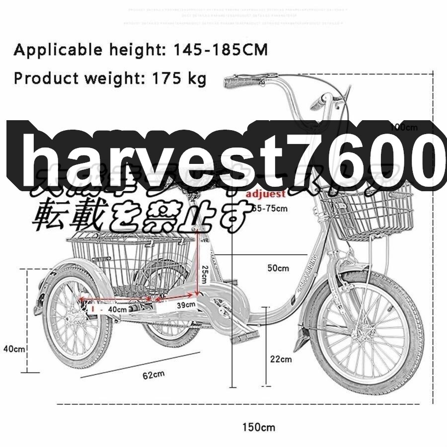 状態:新品未使用 着実かつ頑丈:この人力車の三輪車は、高炭素鋼の厚みのあるボディのボディで設計されており、より強力です。 より安定した4本のタイヤを装備。 ディファレンシャルギア、よりスムーズなステアリング、より小さな回転半径。 フロントとリアのディスクブレーキ。 高さ調整可能:座席の高さは、あなたの高さに応じて自由に調整することができます。なハンドルバーは、快適なグリップとライディングのための高品質のゴム製です。容易ライダーの安全性を確保する。 ていしブレーキ:ブレーキを押しながら、駐車ボタンを押して、ブレーキを止めて、ブレーキの状態を維持します。再度ブレーキを押して、ボタンは自動的に飛び出して、ブレーキのブレーキを放して、車両は正常に走行することができます デュアルブレーキシステム:前後のデュアルブレーキシステム、敏感なブレーキ。フロントブレーキキャリパーとリアブレーキキャリパーは、両親の安全を保護することができます。 負荷容量:160kg塗装工程:ニスを焼く体材:高炭素鋼リム:ダブルリムを厚くしました製品の利点:便利/走行/アンチロールオーバー/ローディング手動測定により、2~3 cmの誤差をお楽しみください。特徴:1.大容量ショッピングバスケット2.最大170kgの容量を支える強い鋼構造3.マッドガードを持つ大きな車輪はそれらをきれいに乾かします4.人間工学的なゴム製ハンドルはあなたが便利に感じさせるようにします5.滑り止めと耐摩耗性のゴム製タイヤ6.安全で敏感なデュアルブレーキシステム7.調整可能なシートとハンドルバー8.自転車のフロントフレームは環境にやさしいプラスチック製で、高プラスチックで、変形しない適用可能な目的:大人/高齢者駐車場、駐車場:簡単にそれが簡単に乗るに高齢者のために作る、モードを切り替えますブレーキをロックし、ブレーキ状態を維持すると同時に、ブレーキを押し駐車バックルを押したままプレスブレーキは再び、バックルは自動的にブレーキレバーを放し、ポップアップ表示されます、そして車両が正常に駆動することができますフロントとリアのデュアルブレーキディスクブレーキ:普通のブレーキと比較すると、ディスクブレーキは安定し、省力化、安全で、高速で、かつ優れたブレーキ効果を持っています1.納入後、自転車に傷がペイントされますか?自転車は大型商品です。彼らは厚いパッケージに梱包されていますが、塗装の傷少量の長距離輸送の際に避けられません。ペイント傷が品質上の問題として返されません。気にされる方は、ご注意ください。2.あなたは、あなたがそれを受信したときにそれをインストールする必要がありますか?彼らは工場を離れるとき、すべてのバイクの85%がインストールされています。お客様は非常に簡単で、残りの部分を、インストールする必要があります。しかし、あなたが車をインストールしてデバッグするプロを見つけることをお勧めします。注:長距離輸送の間に、わずかなバンプと剥離塗装は避けられません。 ★商品写真はできる限り実物の色に近づけるよう努めておりますがご使用のPCモニター設定や部屋の照明により多少、色の変化が感じられる場合がございます