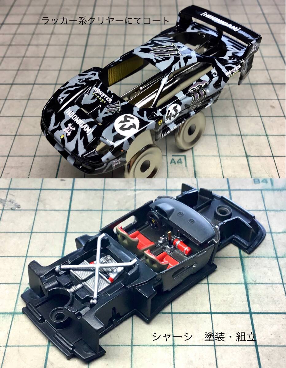 デカール貼付後に、ボディ本体はラッカー系艶有りクリヤー、リヤウイングはラッカー系半艶クリヤーにて、吹き付けコートしてあります。