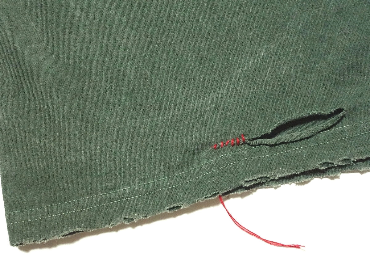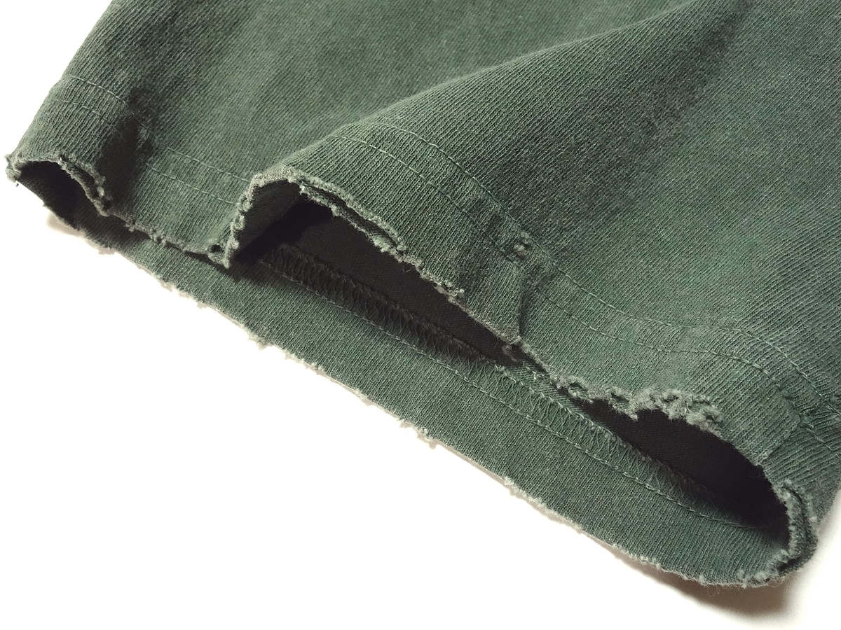 左胸にミニ刺繍が入った定番のTシャツにダメージ&ピグメント加工を施したスペシャルモデルになります。 首回りや袖口、裾にはダメージ加工が施されており、本体はピグメント加工で染色されています。 その後、更にハードな加工を施す事により、生地の毛羽立ちや色ムラが増して 長年かけて着古した退色や日焼けを再現した仕上がりです。 毛羽立ちや色ムラが強いため、光の当たり方により、 写真よりも色合いが明るく(薄く)見える事や暗く(濃く)見える場合がございます。 正確な色合いを出す事が困難ですので、多少の誤差がございます事をご了承下さいますようお願い致します。 生地は天然成分による特殊加工が施された「ステイフレッシュコットン」を使用しています。 酸素や水分と反応して抗菌、防臭機能と制菌作用を発揮し、汗の匂いや室内干しなどの嫌な匂いを大幅に軽減します。 更に抗ウイルス作用が繊維上の特定ウイルスの数を減少させるというコットン100%の機能素材です。 形は全体にほど良く余裕を持たせたリラックスシルエットになります。 極端なビッグシルエットではなく、適度な余裕で合わせやすい形です。 ヴィンテージアイテムをイメージしたデザインですが、形は現代的できれいなシルエットになっています。 状態は一度着用したのみの古着になります。 加工以外の傷や汚れはなく、着用による使用感がほぼ見られない美品です。 ダメージやほつれが増している部分などはなく、 購入時と大きく変わらない状態となっているため、まだまだ問題なくご着用いただけます。 |