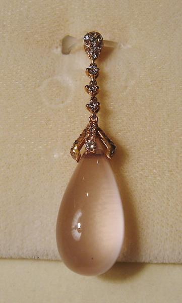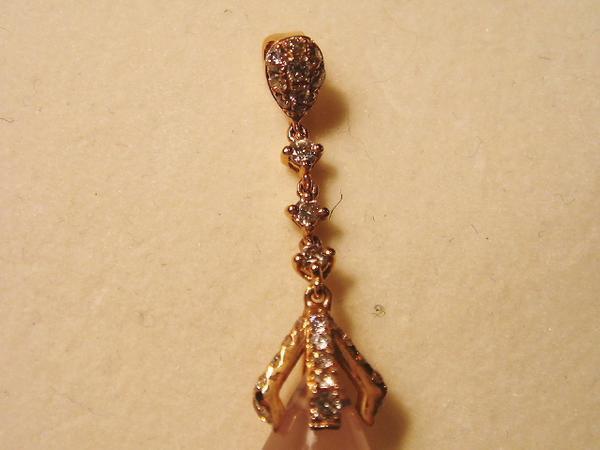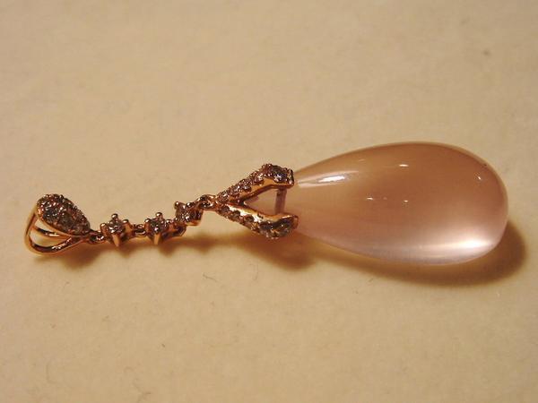 ダイヤをふんだんに使った枠が、しっかりした4本の爪でローズクォーツをがっしり掴んだデザイン(実際は爪で留まっているのではなく芯棒が通っています)。