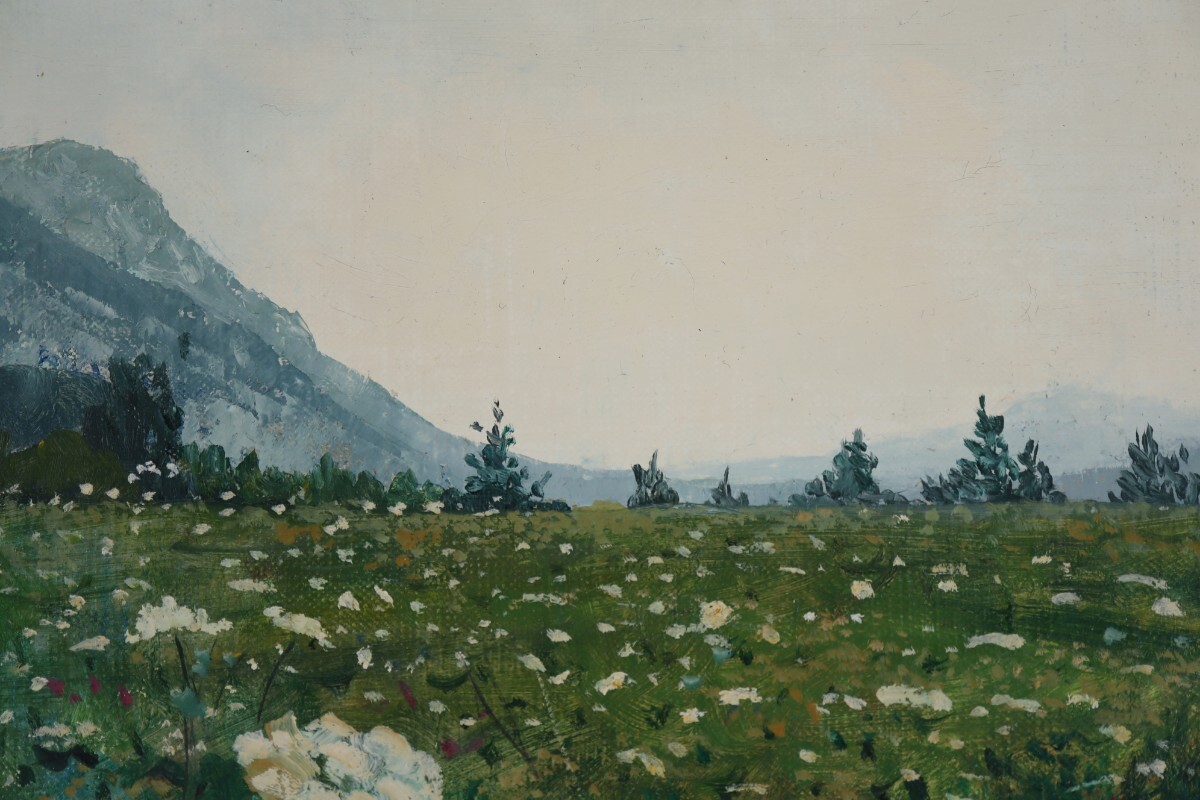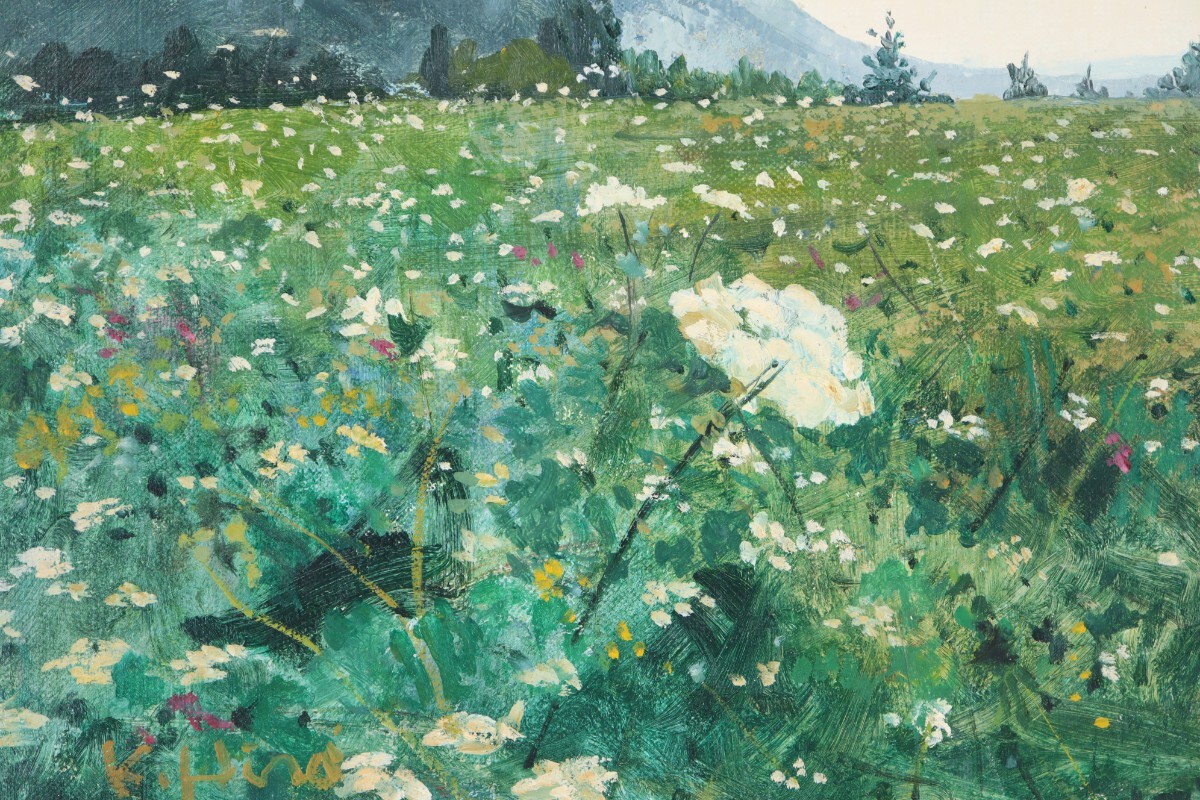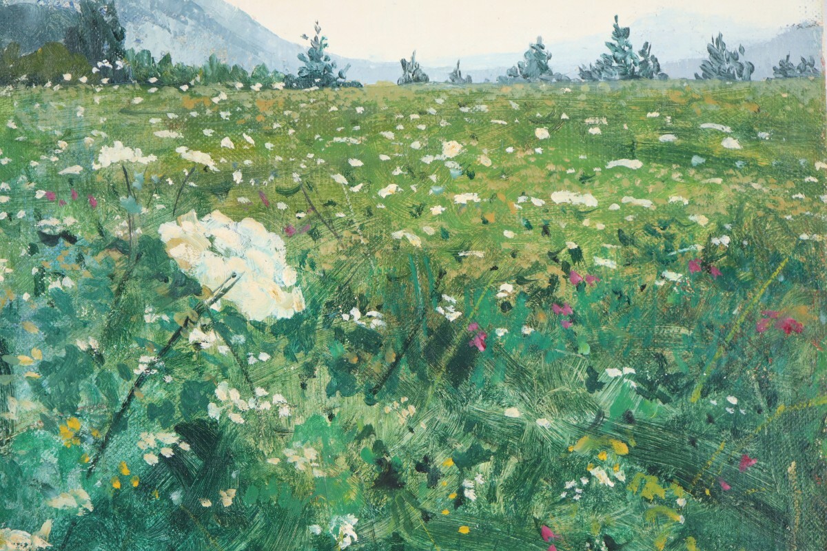 手前に広がる野花の咲き乱れる緑の平原が、