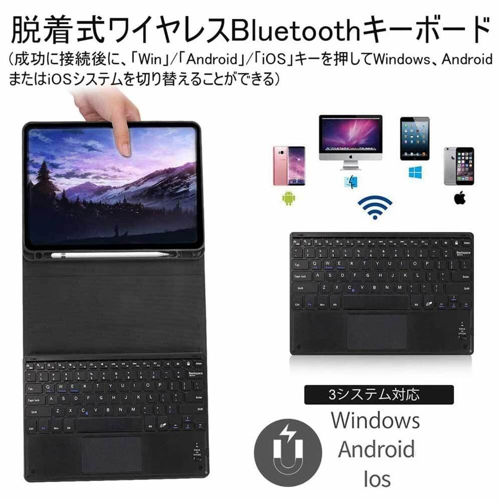 | 商品説明 | ケースは本体だけでなく液晶全面も保護する手帳タイプ。外側は軽くてしっとりと柔らかなPUレザー素材を使用し優しい手触りで耐久性にも優れています。内側はマイクロファイバー素材でiPadを優しく守り、傷や汚れからしっかり保護します。キーボードは着脱式のため、キーボードが不要な時は、ケースとしてそのままお使いいただけます。キーボードはトラックパッド搭載していますのでマウスを使う必要がありません。初期設定が終われば電源を入れるだけで自動接続。簡単な初期設定でノートPCに変身します。Bluetoothで接続で煩わしいケーブルは必要なし。便利なタッチペン収納スペース付きです。リチウムイオンポリマー電池内蔵。充電式。※充電ケーブル付属(USB TYPE-C入力) |