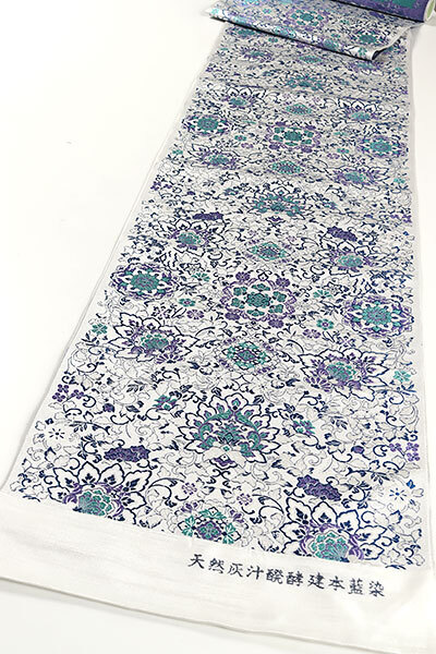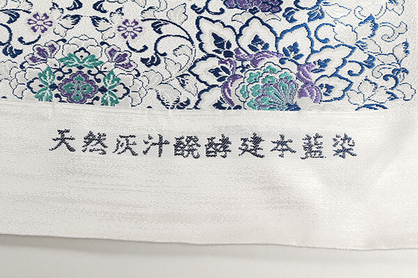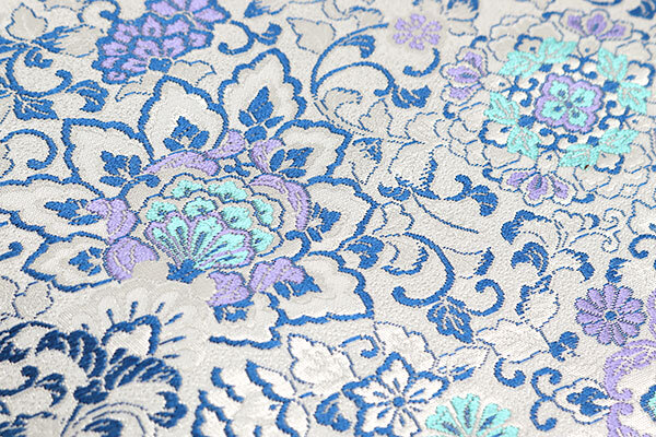 全体には、紺色、青紫色、翡翠色、銀の箔糸で、華文や更紗模様が織り上げられております。
