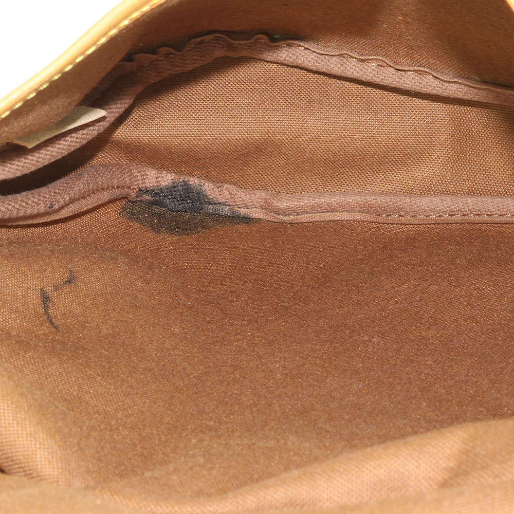 商品状態 | 通常使用における傷、汚れございます。 モノグラム表面に摩耗により若干の艶、薄汚れございます。 ヌメ革に色焼け、黒ずみ、汚れ、傷、ひび割れございます。 内部には毛羽立ち、薄汚れ、擦り傷がございます。 内部に黒いインク汚れが所々に有り、かなり目立つものもございます。 クッション材を入れて撮影しており、クッション材を抜くとペタンとした感じで型崩れがしており、折シワも付いてございます。 |