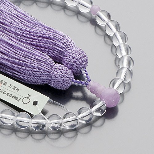 透明な美しい輝きを演出する本水晶を使用した女性用の念珠です。アクセントに薄い紫の中に白色が雲のように見える紫雲石を使用しました。