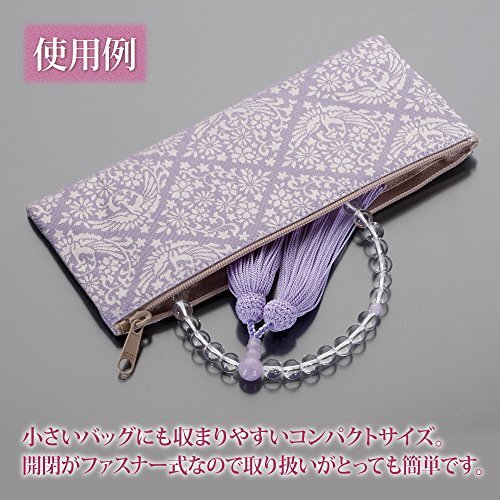 房は京都の伝統工芸である「京房ひも」の職人が製作した正絹頭付房を使用しております。小さいバッグにも収まりやすいコンパクトサイズの高級ファスナー式数珠袋をお付けします。