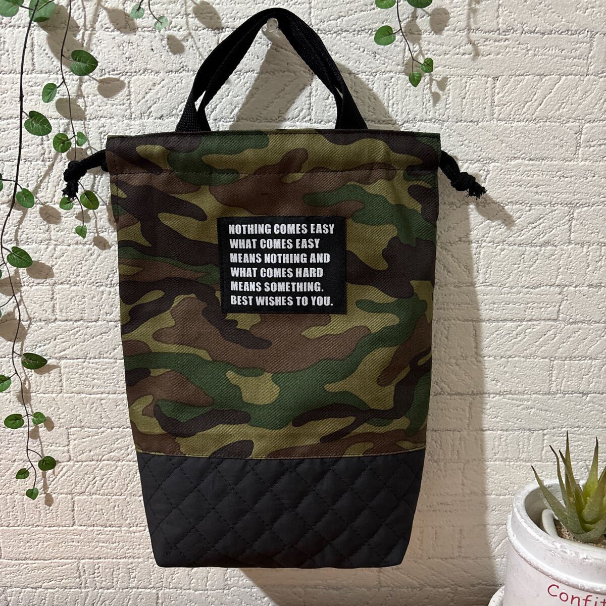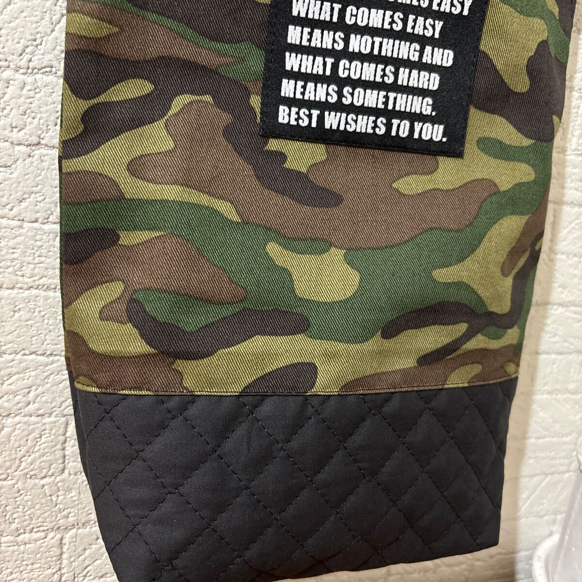 迷彩柄の綿生地とキルティングの切り返しです。 大きいサイズの刺繍タグ(黒)も付けました。