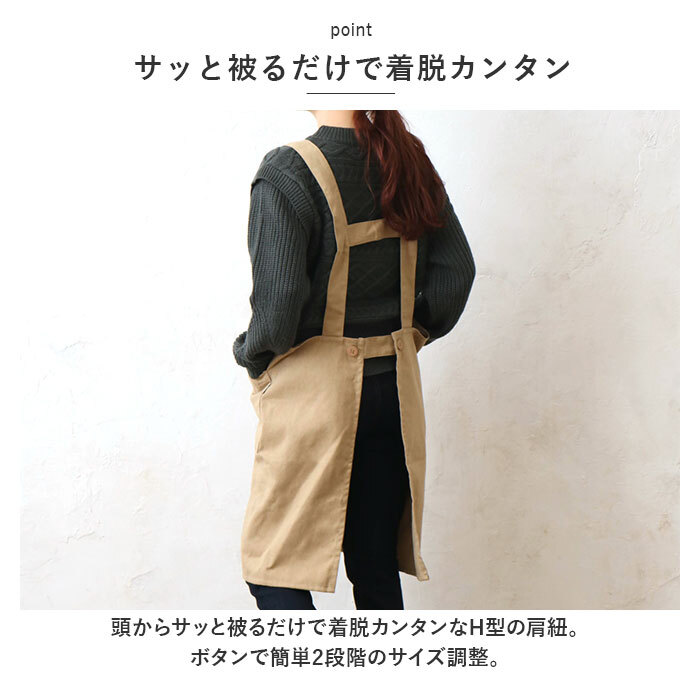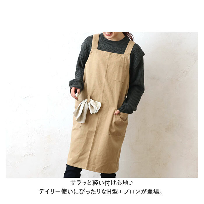 商品説明 | ・・サラッと軽い付け心地♪デイリー使いにぴったりなH型エプロンが登場。 ・【リサイクルコットンを使用】 ・柔らかく肌馴染みの良いリサイクルコットンを使用。気軽にお洗濯ができて、いつでも清潔。 ・【サッと被るだけで着脱カンタン】 ・頭からサッと被るだけで着脱カンタンなH型の肩紐。ボタンで簡単2段階のサイズ調整。 ・【フロントに配置された2つのポケット】 ・フロントに配置された2つのポケットは、スマホやレシピを書き留めたミニノート(A6サイズ)を入れておけて便利。 ・【ペン差しポケットとタオルループ付き】 ・あると何かと便利なペン差しポケット×2とタオルループ付きで、キッチンだけでなく、お掃除やDIY、仕事着としてもおすすめ。 ・【ユニセックス仕様】 ・ポケットにロゴのビスネーム付き。シンプル&ナチュラルなデザインのユニセックス仕様で、家族やパートナーとも共有出来ちゃう♪ |