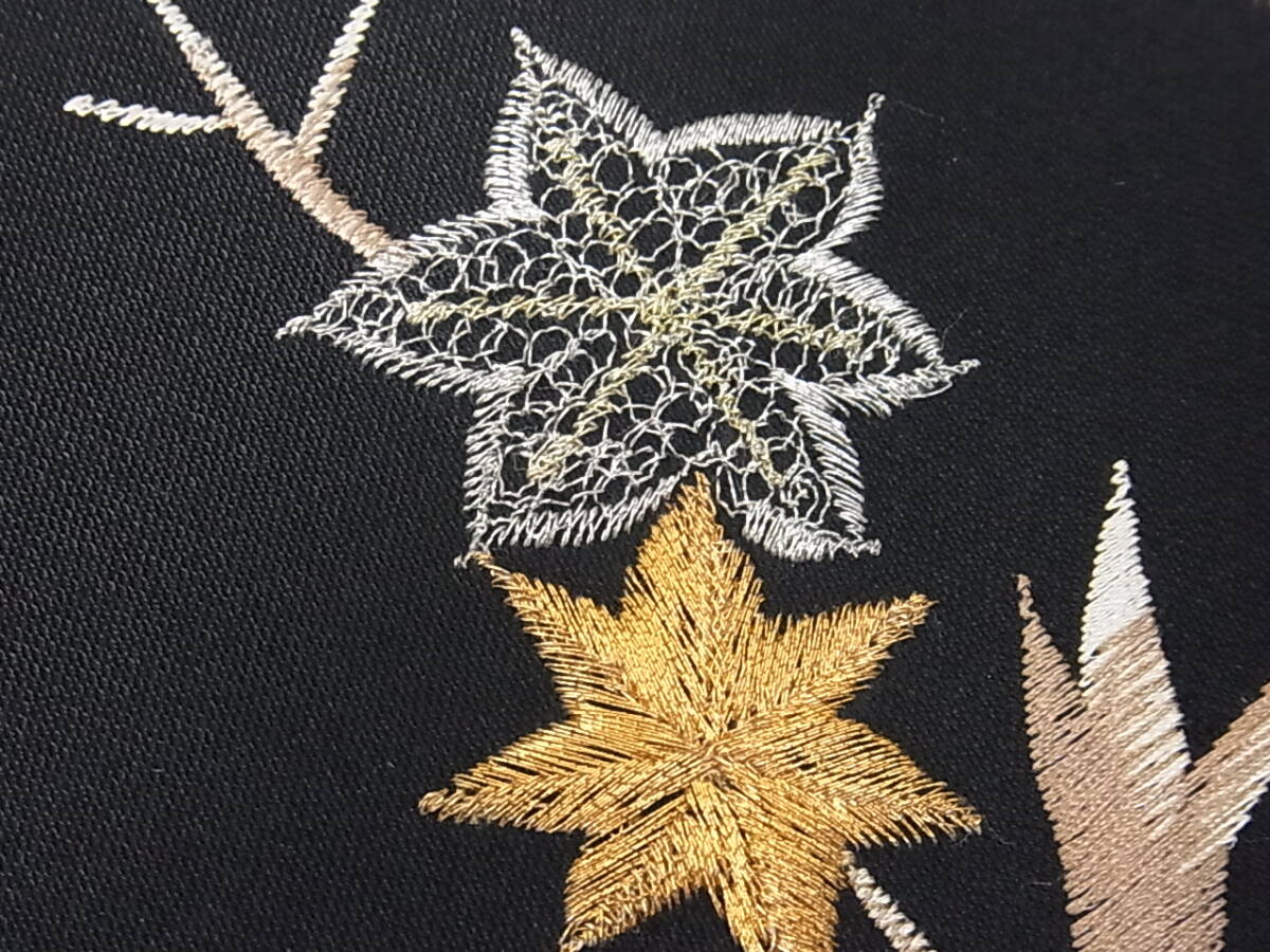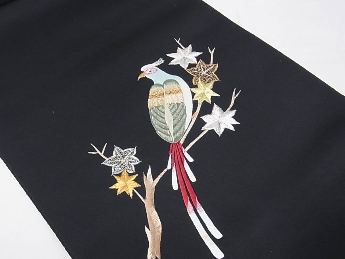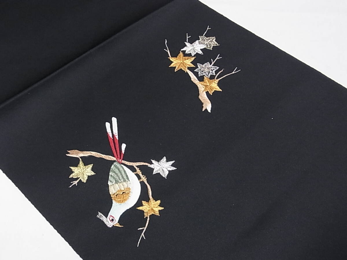 着物おきな2★八寸名古屋帯 総刺繍 楓鳥文 金銀糸 黒色 ポリエステル★r3928