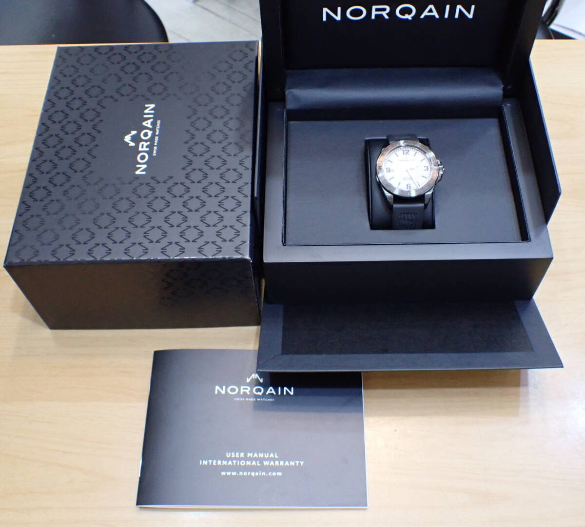 ノルケイン/NORQAIN NNB1001BBWA アドベンチャー/ネベレスト ナイトサイト 自動巻きメンズ腕時計です。 定価約57万円です。 2024年1月に、国内正規店にて購入のものです。 あまり使っていませんので、目立った傷もなく、綺麗です。 ガラスや文字盤も綺麗です。 ベルトにわずかな小傷等がありますが、使用感もほとんどありません。 正常に動作しています。 メーカー保証もまだ付いています。 箱、説明書、ギャランティ付きです。 ケース径約40mm !オークション終了後、24時間以内に「お取引を始める」ボタンをクリックして、必ず取引をスタートして下さい。 取引のスタートが無ければ、削除させていただきます。 必ず厳守してください! 「新規ID」「直近で悪い評価が多い方」のトラブル(イタズラなど)が非常に多いです。 当方が、お取引に支障があると判断したID(特に新規ID)は削除します。 ●ジャンク品と記載の物の商品到着時の動作保証はありません。 ●付属品等は、写真に写っているものですべてです。 | ||||