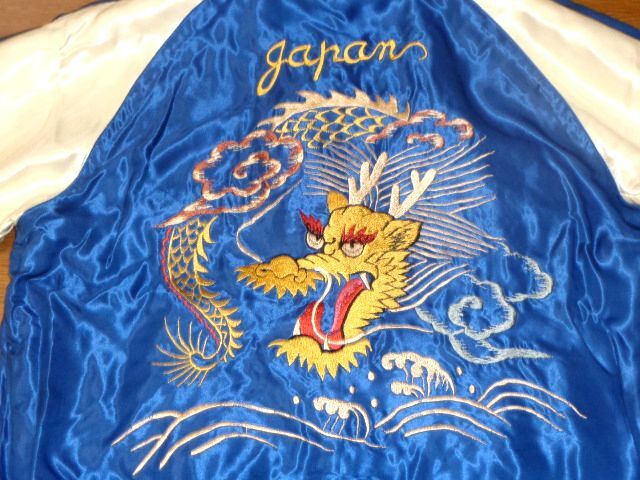 〇リバーシブル面は波飛沫とともに水辺から姿を現す金龍の絵柄。晴天を想わせるブルーのボディをベースに、長い体躯を雲間に隠しながら迫り来るダイナミックな構図が特徴で、龍の顔にのみ黒いアウトラインを入れることで遠近感と迫力を強調している。胸には鷲と虎が描かれており、スカジャンの三大モチーフである鷲・虎・龍が揃った贅沢な一着。