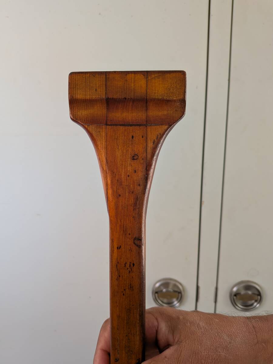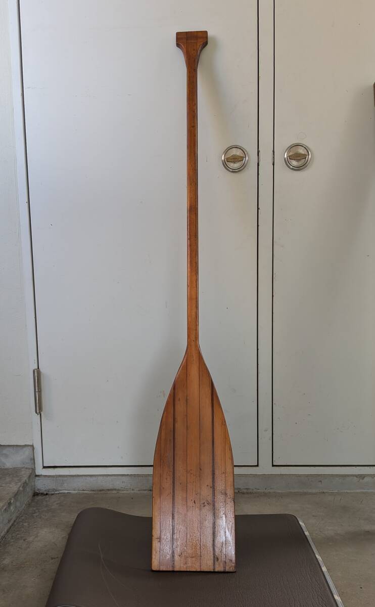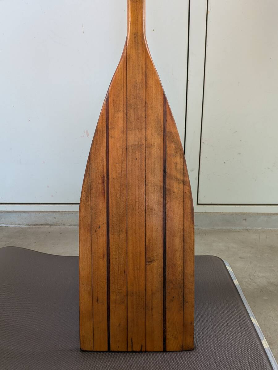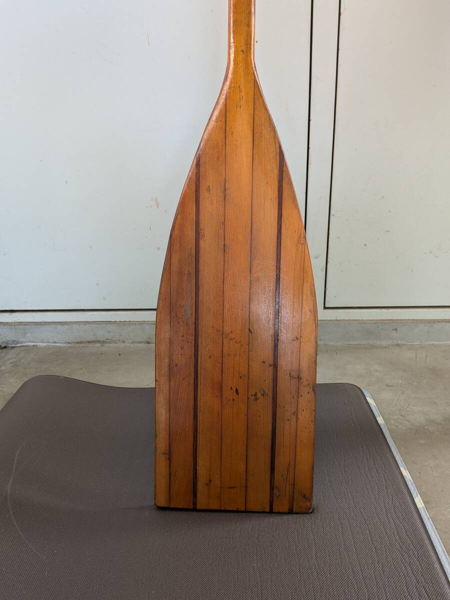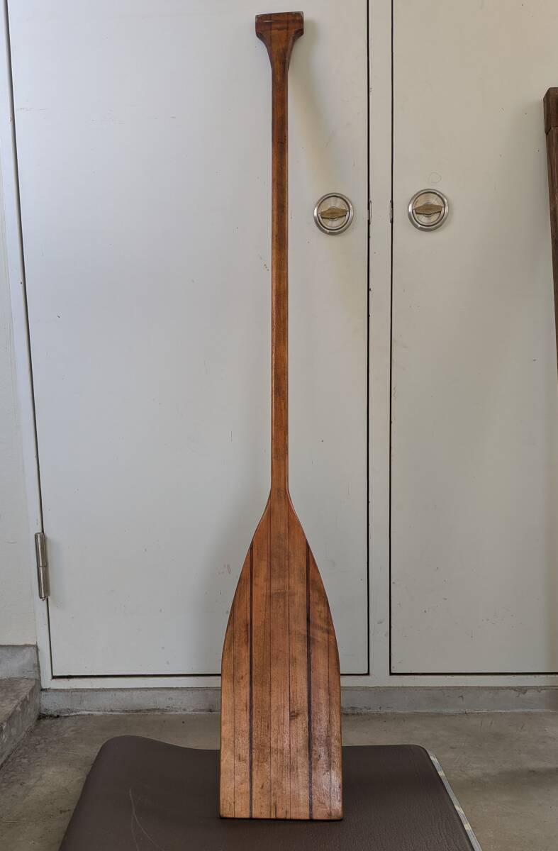 40年位前に作ったオリジナルカヌーパドルです。材質は米ヒバ材とアクセントにローズウッドになります、長さ約137㎝幅約19cmです長年の汚れと傷塗装のはげなどもあります。狩猟で沼での鴨撃ちなどで使用してました。オブジェなどでいかがですか。NC NRです