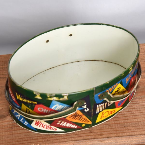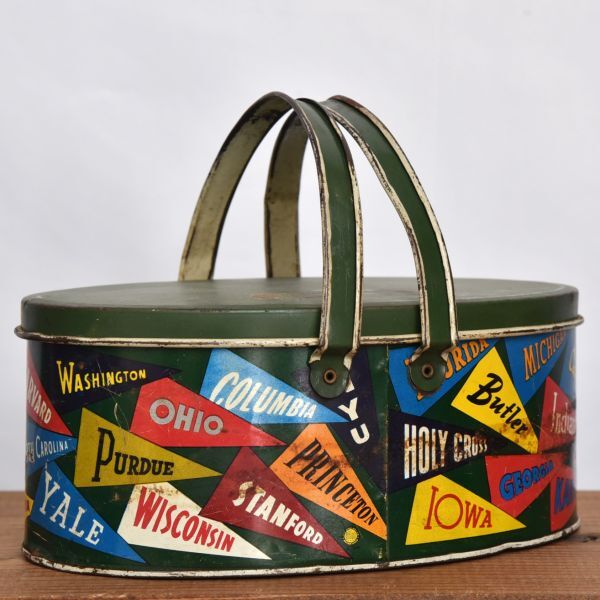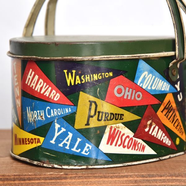 雰囲気◎ 60s ブリキ カレッジ ペナントカン ヴィンテージ USA製 アイビーリーグ YALE PRINCETON 雑貨 缶 家具 インテリア