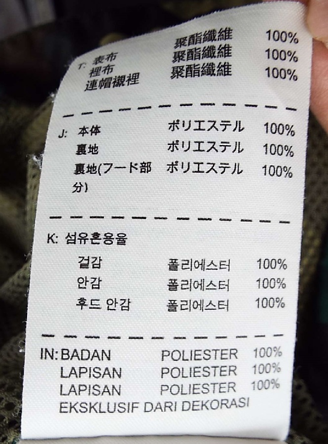 | 素材 | 本体・裏地・裏地(フード部分):ポリエステル 100% | ||||||||||||||||||||