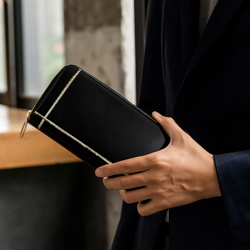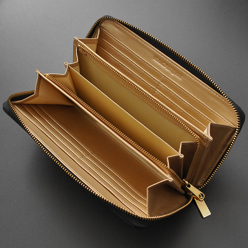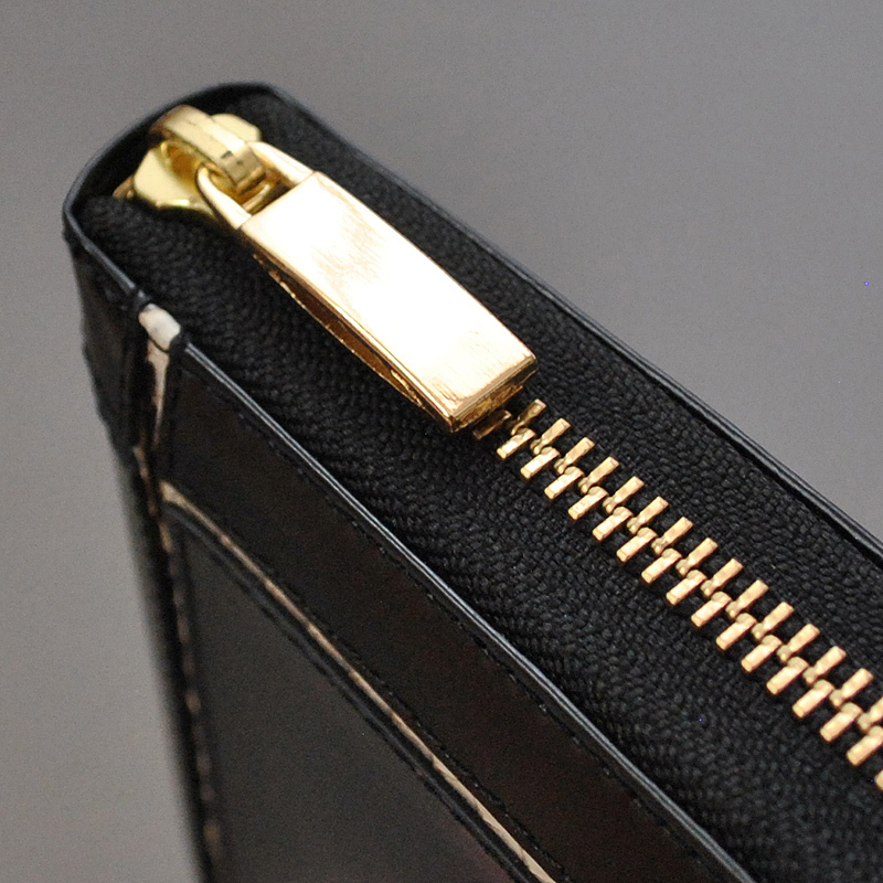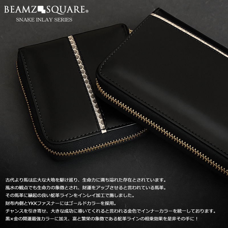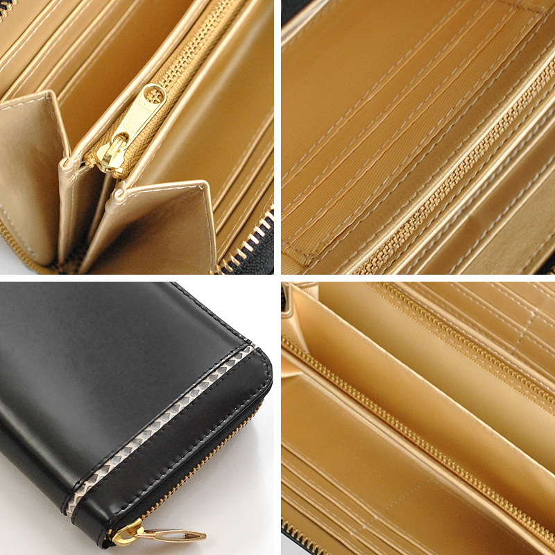 | 規格 | 【カラー】:ブラック×ゴールド 【仕様】:2室構造、センターファスナー小銭入れ(仕切り有り)、カードポケット×15、 フリーポケット×2 【素材】:外側/馬革、内側/フェイクレザー&ナイロン、ライン部分/蛇革、ファスナー金具/全箇所YKK社製(ゴールドカラー) |
