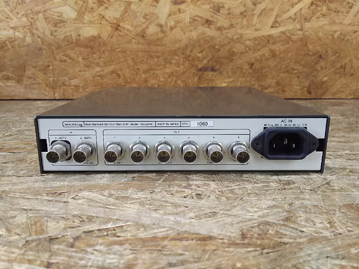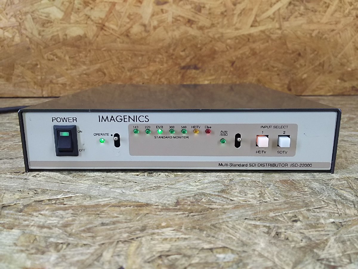 IMAGENICS ISD-22000 Multi-Standard SDI DISTRIBUTOR HD/SDーSDI信号分配器 6分配器 ーーーーーーーーーーーーーーーーーー ●メーカー: IMAGENICS ●型 番: ISD-22000 ーーーーーーーーーーーーーーーーーー ●映像機器、本体、テレビに繋ぎ、HDTV IN→OUT1~6で映像が出ている事を確認しました。 その他の端子は未チェックです。 ●専門ではない為、上記の簡単な操作のみ確認しています。 それ以外の詳細な設定等は確認しておりません。 ◎付属品 本体のみ ◎外観 本商品は中古品です。経年・使用に伴う擦り傷/汚れがあります 外観等を著しく気になさる方や新品に近い美品をご希望の方はご遠慮ください 筐体に傷がございます。 ●詳しい仕様等、商品についてはメーカーサイトなどをご参照ください ※保証期間内であっても,水没・落下などお客様が原因で起こった不具合は保証対象外です ※ハードウェア、ソフトウェアに関するサポートは行ってません