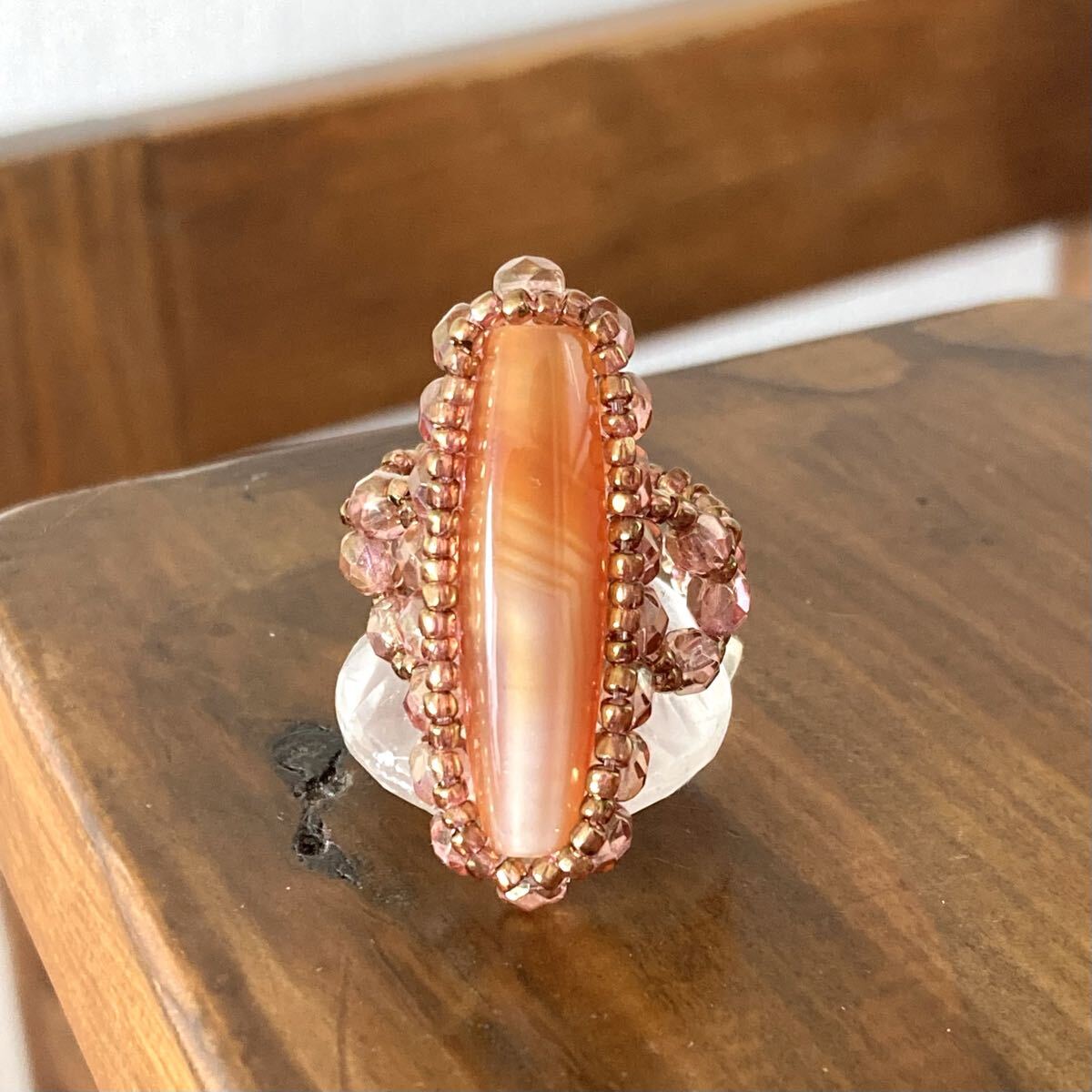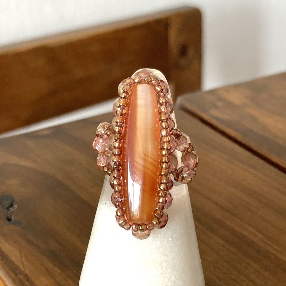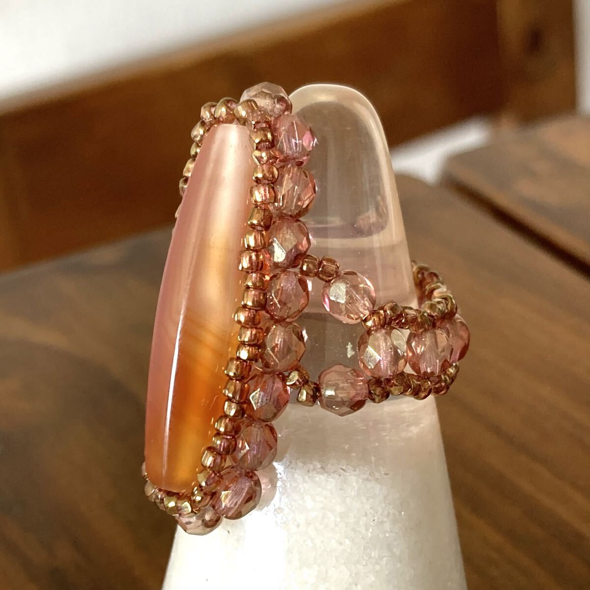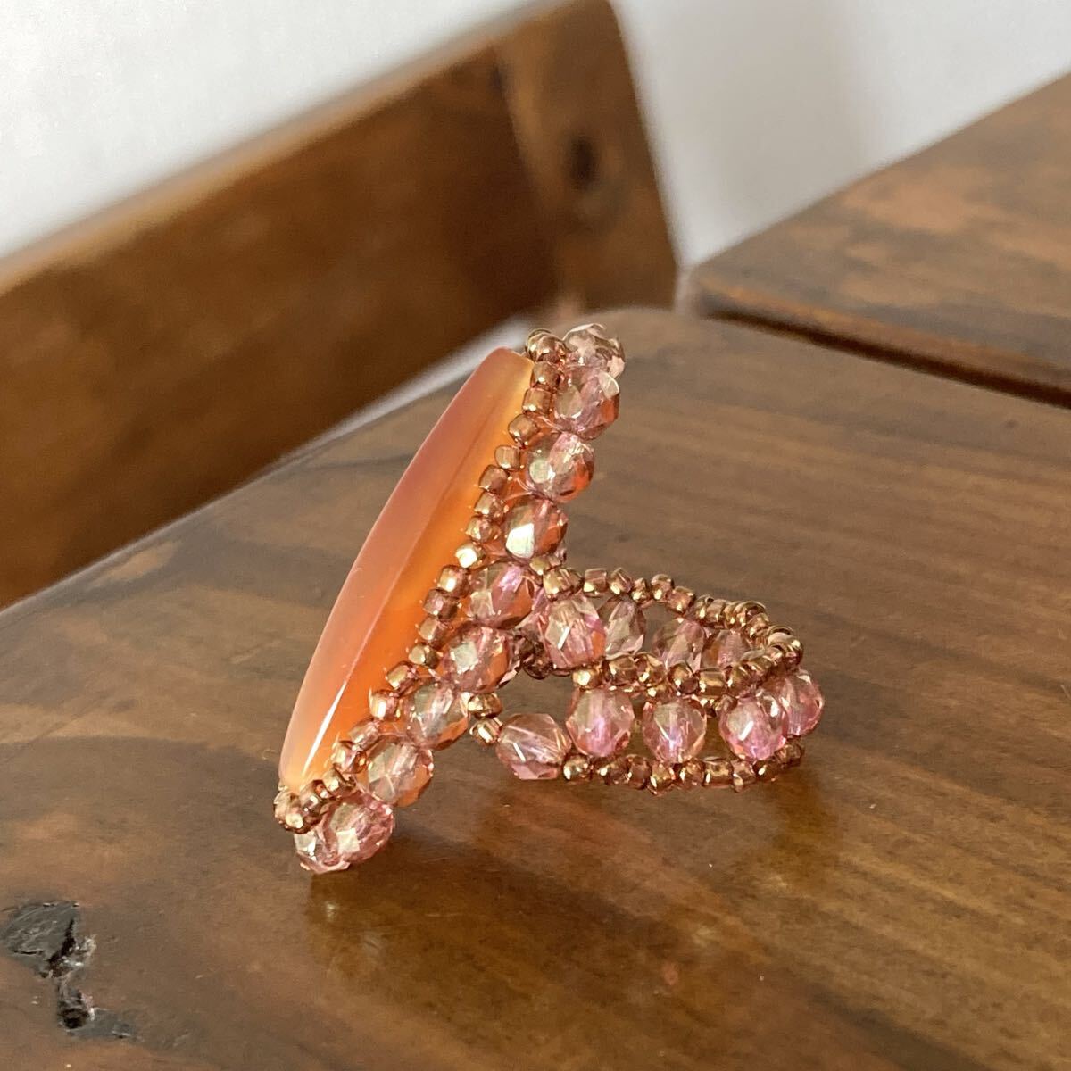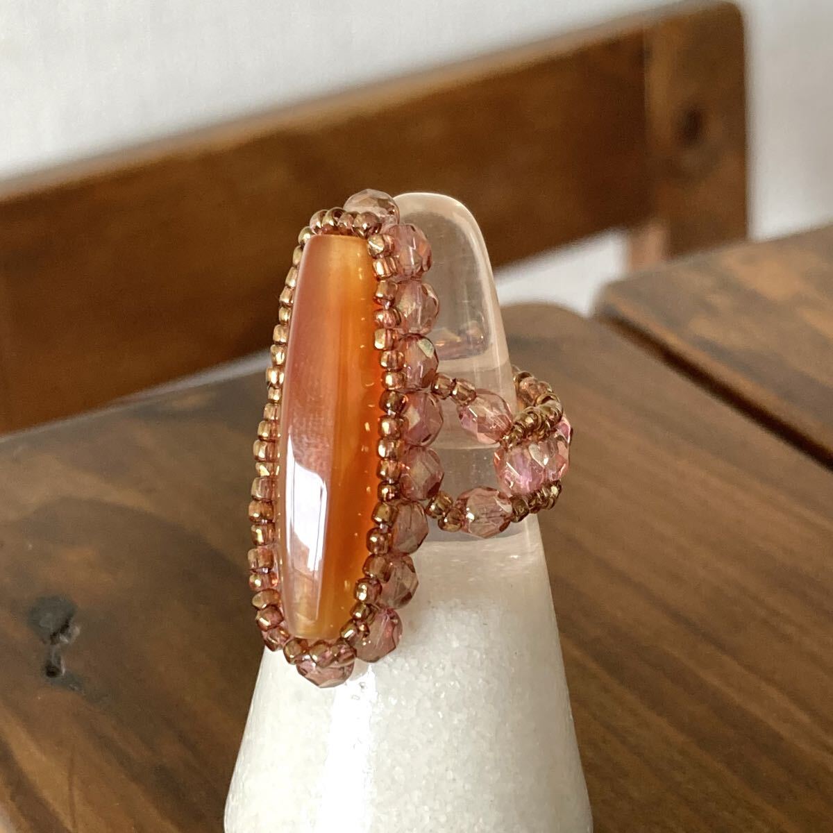 30mmのオレンジの天然石のナツメビーズ、4mmのラスターピンクのチェコビーズ、ブラウンのスリーカットビーズで作ったリングです。